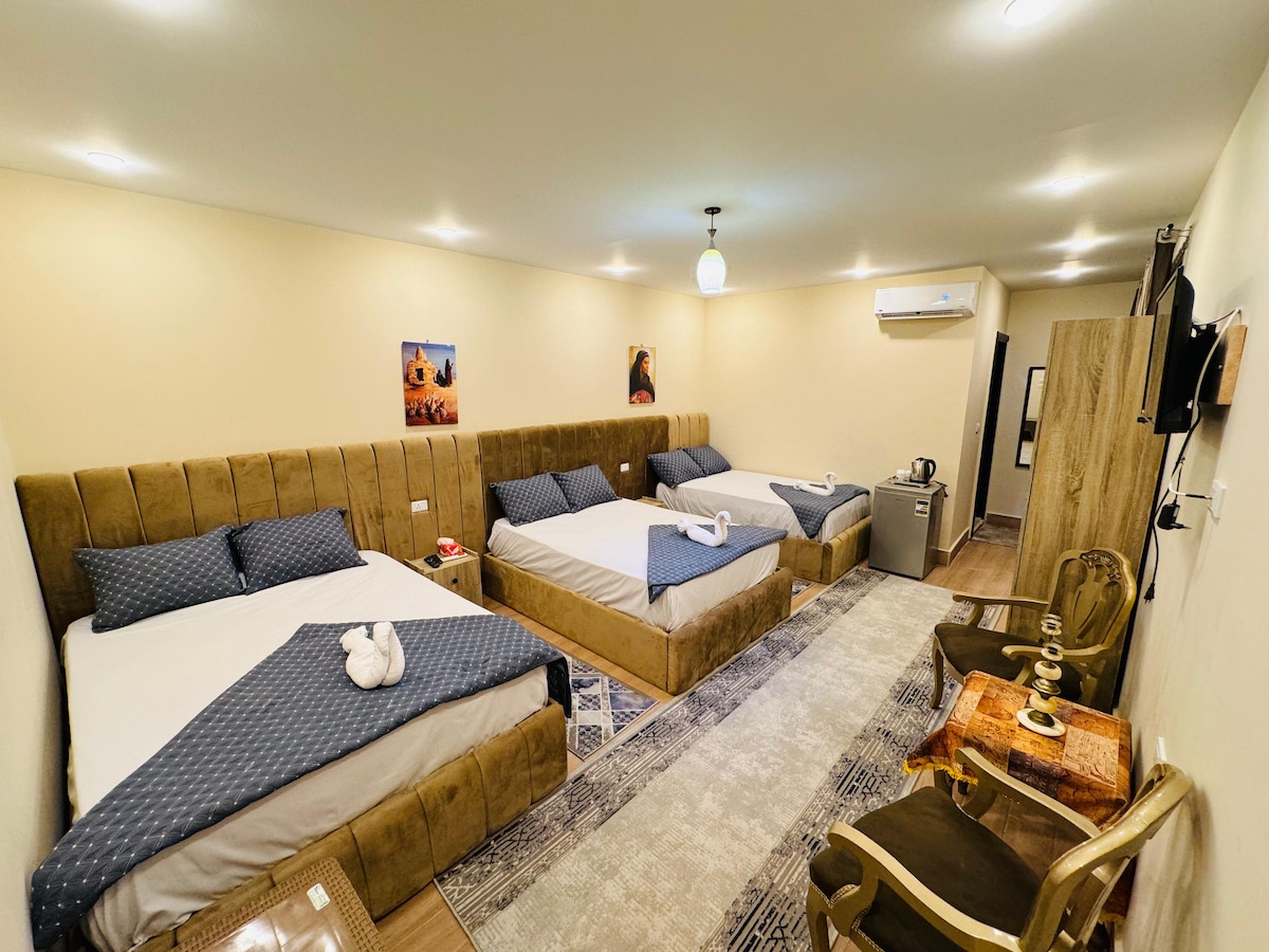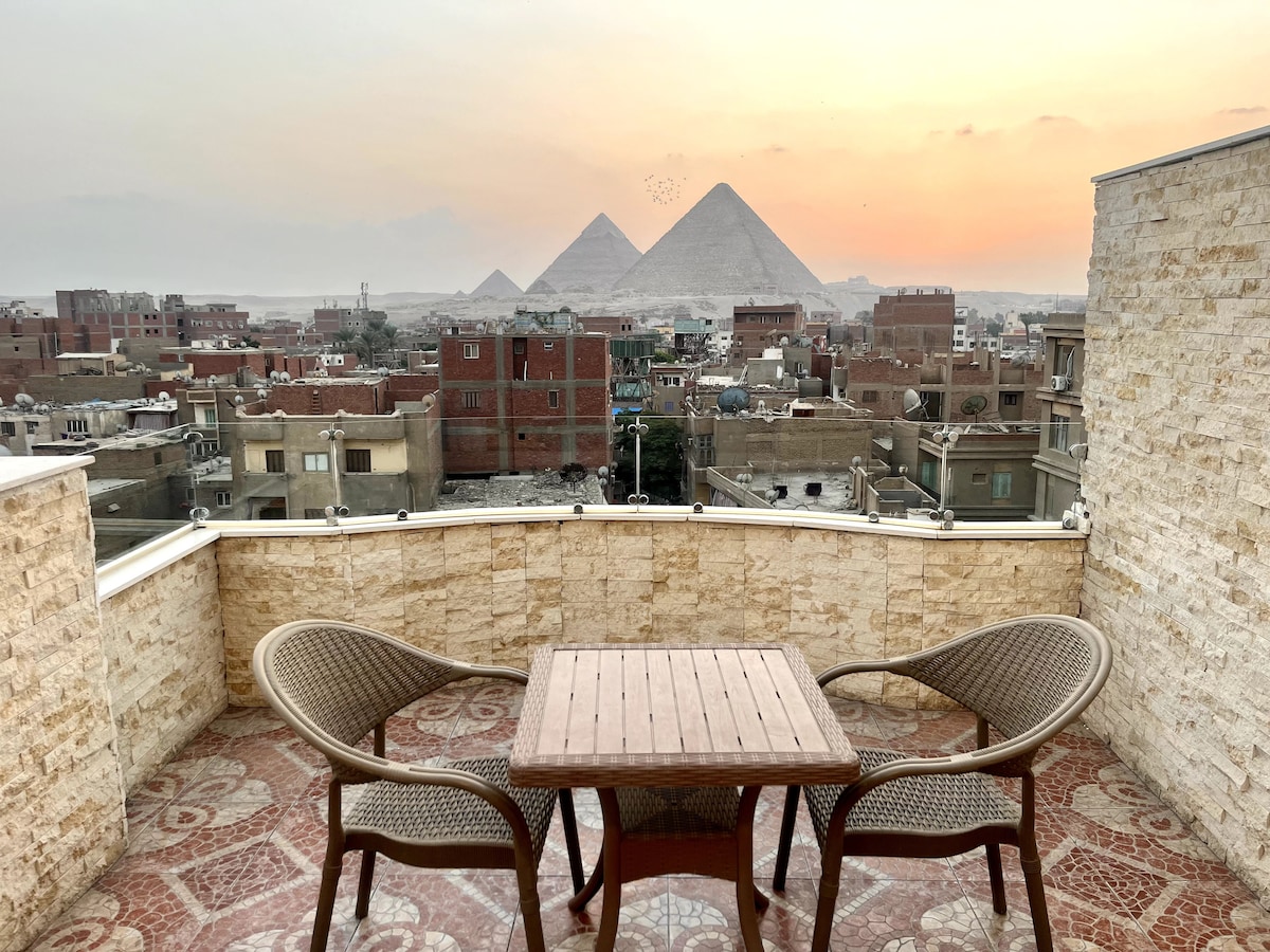 Matatagpuan isang bato lang ang layo mula sa pasukan ng lugar ng mga piramide ng Giza, masisiyahan kami sa mapayapang timpla ng modernong kagandahan at makasaysayang kadakilaan. Nagpapatuloy ka man sa panorama sa rooftop o nasisiyahan ka man sa kamahalan ng mga pyramid mula sa iyong sariling pribadong balkonahe, ang bawat sandali ay nagiging koneksyon sa kahanga - hangang nakaraan at masiglang kasalukuyan ng Egypt. Nagsisimula ang iyong paglalakbay sa mga kababalaghan ng Giza sa sandaling pumasok ka sa aming maingat na idinisenyong tuluyan.