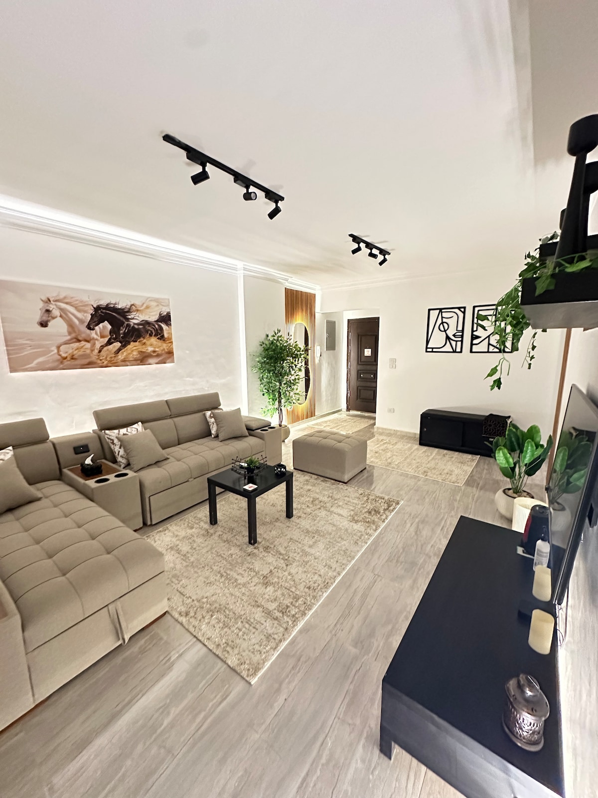 Maluwang na 2 silid - tulugan na apartment na nagtatampok ng unang hilera ng nakamamanghang tanawin ng mga pyramid. Gamit ang pinakamadaling accessibility para sa isang pyramid view property, na direktang matatagpuan sa tabi ng pangunahing kalsada, at sa tabi mismo ng bagong Grand Egyptian Museum. Ang bagong inayos na maaraw na apartment na ito ang eksaktong kailangan mo para sa hindi malilimutang pamamalagi sa panahon ng iyong biyahe sa Egypt.