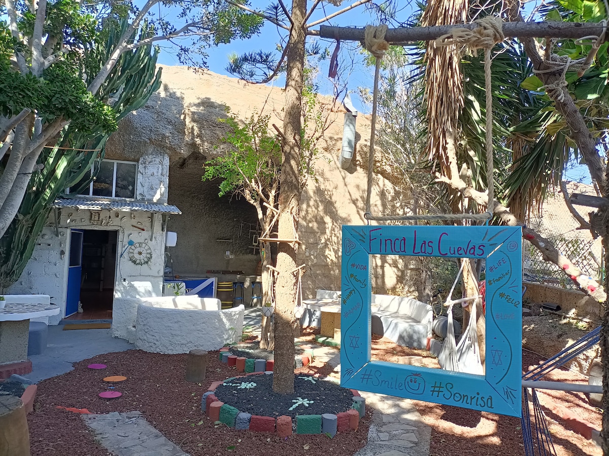 Alquiler Casa Cueva VV Komm an diesem unvergleichlichen Rückzugsort wieder in Einklang mit der Natur. Mag-enjoy sa ginhawa ng bahay-kuweba na ito na may projector, dalawang double bed at malaking 3x4m na semicircular couch/bed, pribadong 16m2 na roof top terrace para makapag-enjoy ng mga nakamamanghang pagsikat ng araw, pagmamasid sa mga bituin, malamig na beer pagkatapos ng beach o araw-araw na yoga na nakaharap sa pagsikat ng araw. Gamitin ang 2 ha na shared space na may pool at outdoor gym. Paligid ay kalikasan na may hiking trails. 15 minutong biyahe sa beach