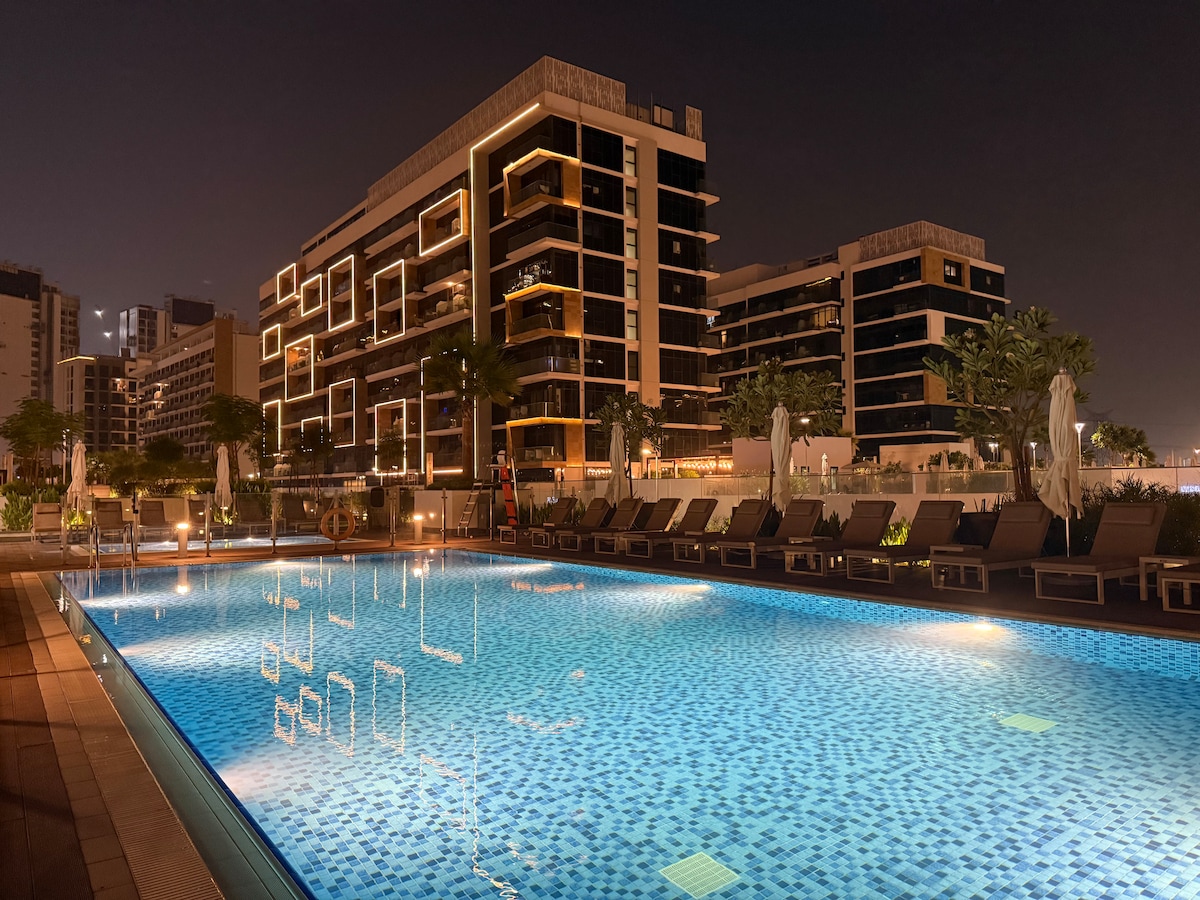 marangyang apartment na 1Br sa Collective2.0 na may kamangha - manghang bukas na tanawin sa pool, na angkop sa komunidad ng Dubai Hills ng Emaar. Ang Collective2.0 ay may bagong - bagong tower na may pinakamagagandang amenidad kabilang ang maluwag na co - working area, Gym, pool, Cinema, play station, billiard, baby foot na libre para sa mga bisita. Ilang minutong biyahe lang ang layo ng gitnang lokasyon mula sa Downtown Dubai o sa Marina. Puwede kang maglakad anumang oras para maging komportable sa parke, Dubai Hills Mall, Mga Restawran at supermarket.