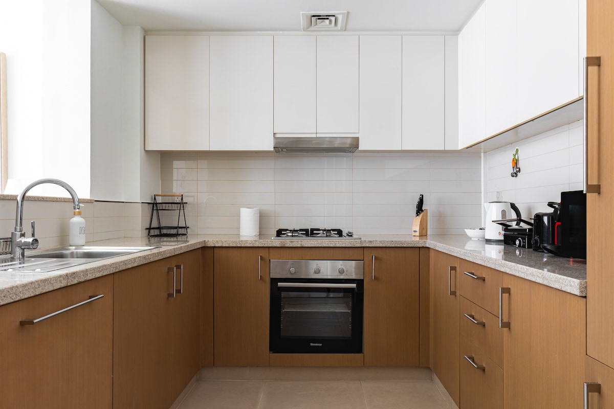 Ang naka - istilong karanasan sa sentral na lugar na ito ay ilang minutong lakad mula sa Yas Marina circuit, Yas Mall, Yas park, Ferrari World, Water park, Climb, Warner Bros theme park, Yas Golf, Yas musical Fountains, beach, Yas Bay restaurant, 20 min sa Airport, Louvre museum & city center, 50m drive sa Lego land, Dubai Atlantis, Burj Khalifa, Dubai mall. Fully furnished 1 bedroom apartment sa gated community na may libreng access sa mga pool, Gym, barbeque area, cycling path, car park. 1 king size & 1 foldable bed