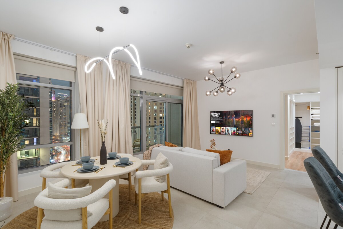 Ang maistilong 2-bedroom apartment na ito na may karagdagang box room ay perpekto para sa mga pamilya, business traveler, o grupo ng mga kaibigan na naghahanap ng kaginhawaan at kaginhawaan. Matatagpuan sa masiglang kapitbahayan na puno ng mga restawran, bar, at parke, 10 minuto lang ang layo mo mula sa nakamamanghang Dubai Marina/ JBR at 20 minuto mula sa buzz ng Downtown Dubai. Sa loob, mag - enjoy sa modernong dekorasyon, komportableng muwebles, at lahat ng pangunahing kailangan para sa nakakarelaks na pamamalagi.