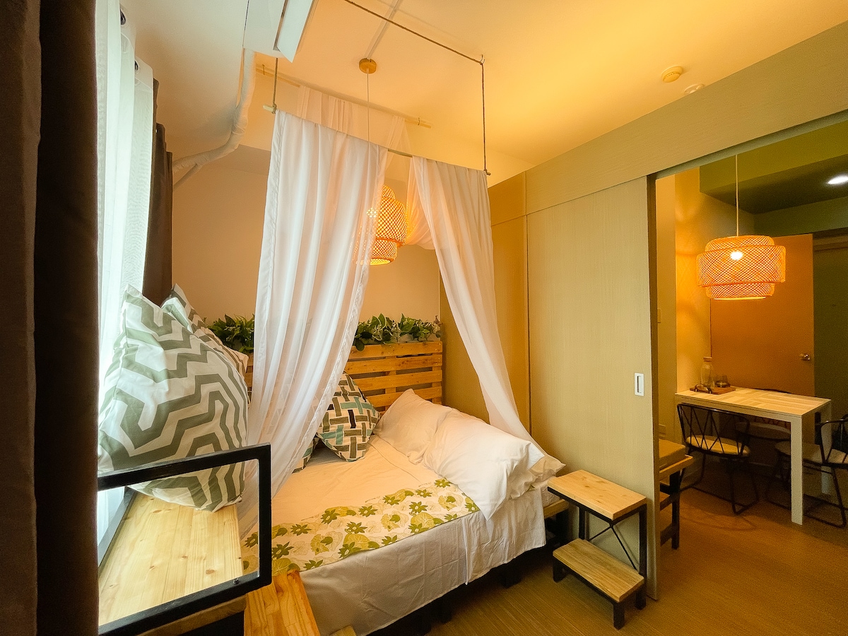I - book ang marangyang tuluyan na ito sa sentro ng BGC. Ilang hakbang lang ang layo ng lahat. Napapalibutan ng mga pangunahing tanggapan at high - end na mall ang mga Uptown Parksuite. Makaranas ng cosmopolitan getaway sa Uptown Mall. Tuklasin ang mga natatanging konsepto ng pagkain at pamimili. Mag - party sa gabi sa mga premier bar sa mismong pintuan mo. Magrelaks sa aming Mid Century Modern bedroom unit. Magrelaks sa queen - sized bed at dagdag na sofa bed. Kasama sa mga kaginhawaan ang 55 pulgada na SMART TV, 400 MBPS internet, lugar ng pag - aaral at pribadong balkonahe.