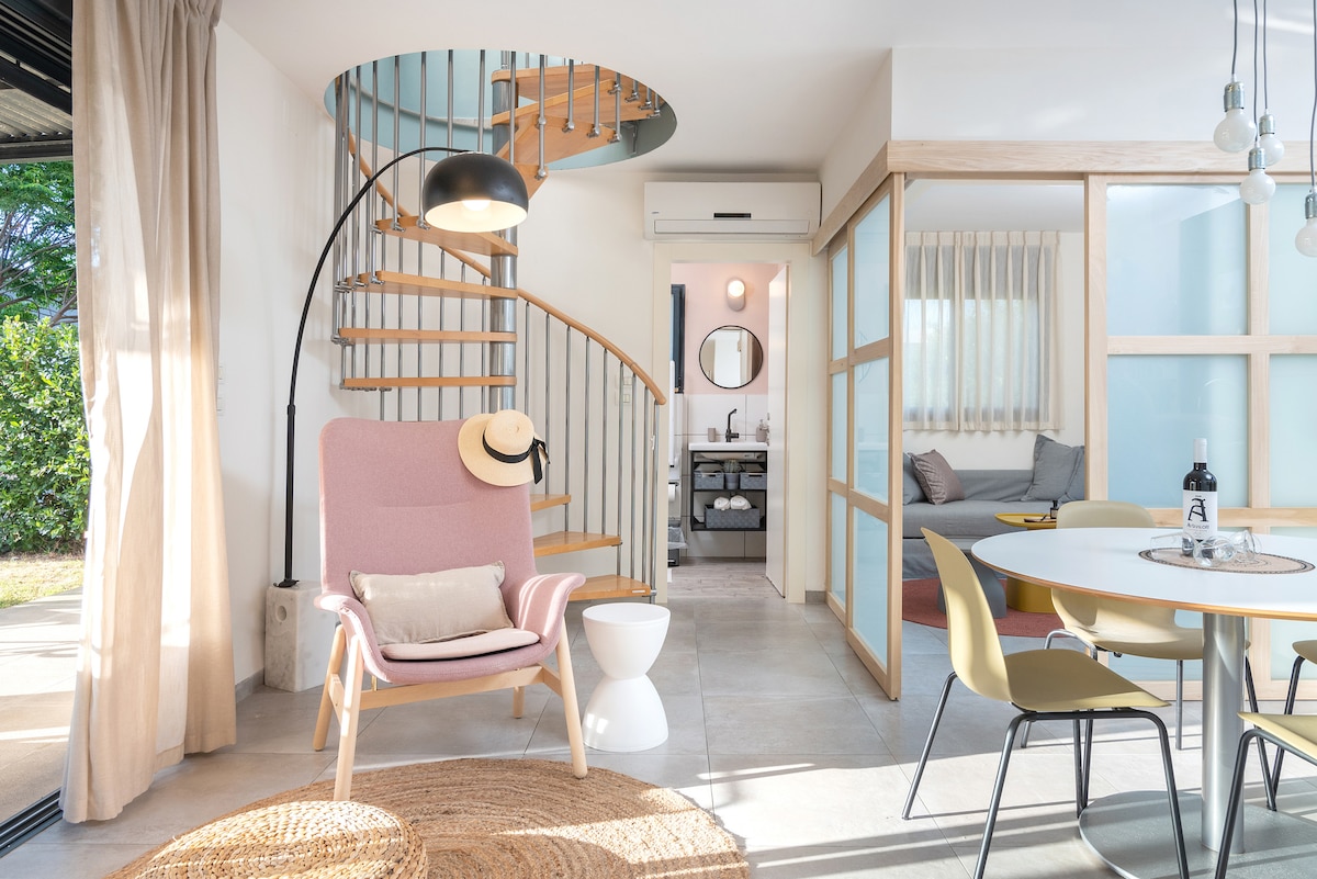 A romantic countryside guest unit in a peaceful village, offering breathtaking views of Beit Netofa Valley. Enjoy stunning sunsets, birdsong, cool summer evening breeze, and a perfect setting for relaxation. The unit includes a covered outdoor terrace with a cold/heated massage pool (MSpa jacuzzi) overlooking the view. Step onto scenic trails and immerse yourself in unforgettable nature. Ideal for couples seeking peace and a deep connection to nature (a forest just below the house).