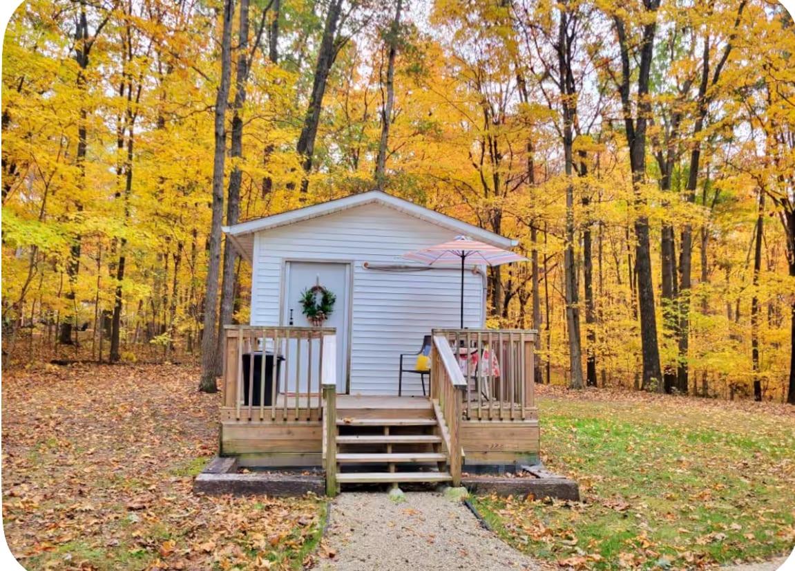 Bumalik at magrelaks sa tahimik at naka - istilong tuluyan na ito. Bago ang 14x40 cottage na ito na may beranda sa harap at likod. Ang front porch ay ang buong haba ng cabin na may 4 na rockers para umupo at magrelaks. Ang back porch ay may seating na tinatanaw ang bukirin at maaari kang makakita ng paminsan - minsang usa na nagpapastol sa bukid. May gas grill din sa back porch. Mayroon kaming bakod na pribadong lugar na may fire pit at mga upuan para masiyahan sa sunog sa malamig na gabi.
