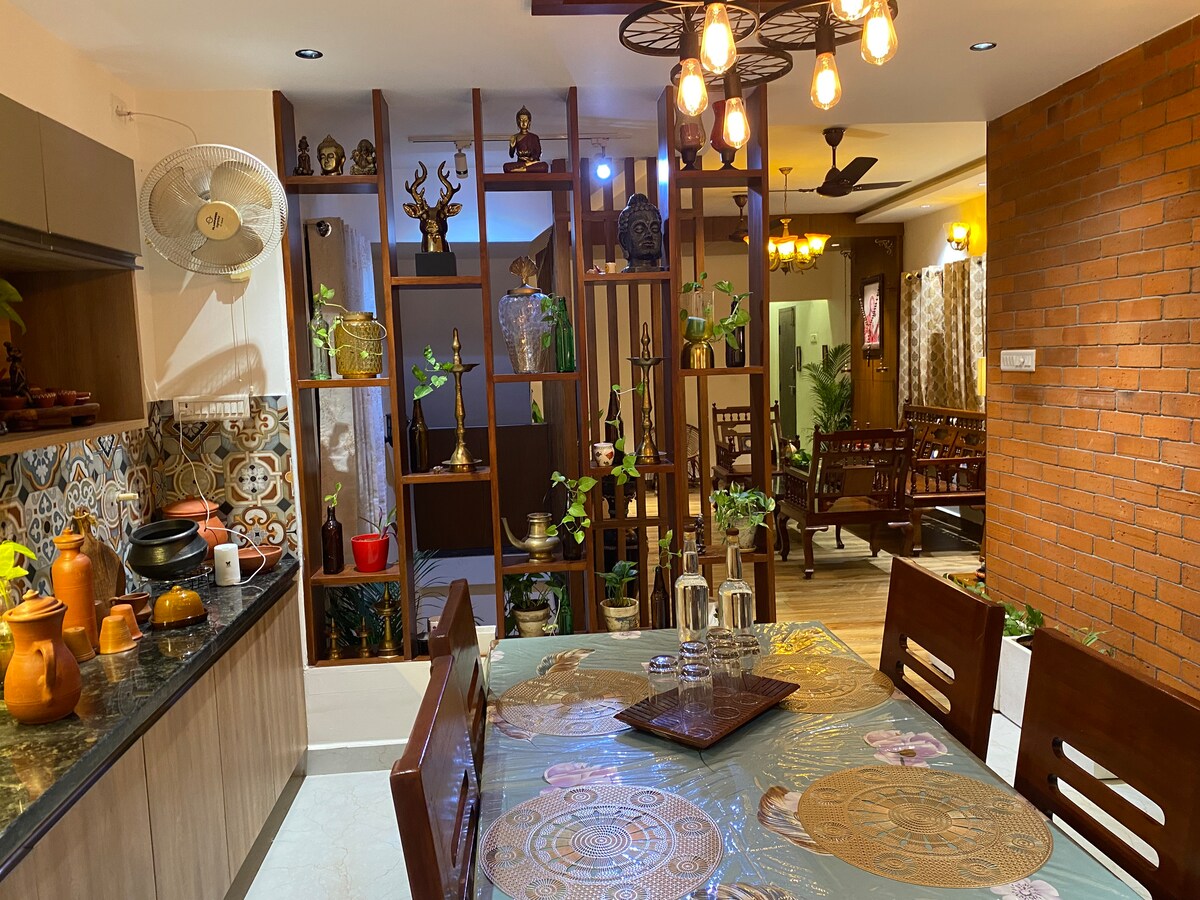 Malinis at malinis ang 2 Double Bed room, Hall at Kusina. LPG Gas stove na may 2 burner na available at mga de - kuryenteng kasangkapan para sa pasilidad sa pagluluto. Linisin ang kubyertos at crockery. Bilugan ang pasilidad ng mainit na tubig. Walang tigil na supply ng kuryente na may inverter backup para sa liwanag at mga bentilador. 1 Km mula sa Iyyappanthangal Bus depot, 2Km mula sa Ramachandra hospital, 3 Km mula sa Aravind Eye hospital, ACS Medical college hospital at Savitha Dental College. Available ang pagkain sa bahay para sa tanghalian at hapunan nang may bayad.