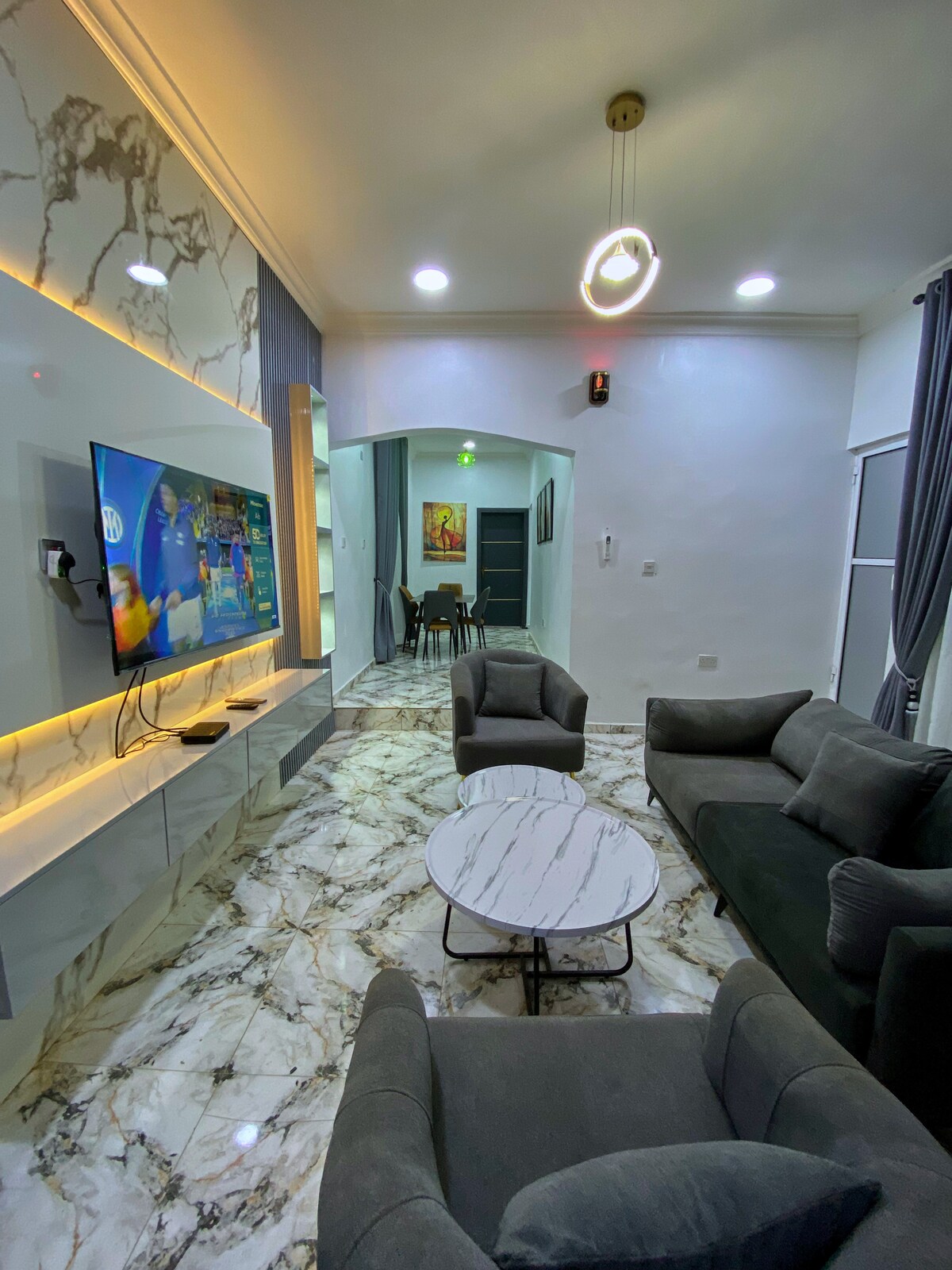 Ganap na ligtas na estate Maaasahang 24hrs Power Mabilis na internet CCTV Camera Maraming mga tindahan sa paligid ng estate upang makuha ang lahat ng kailangan mo at isang pangunahing shopping mall upang makuha ang lahat ng kailangan mo sa buong estate na ito. Hindi mo nais na makaligtaan ang kamangha - manghang lokasyon na ito, perpektong lugar para sa iyo! Ang apartment na ito ay may lahat ng kailangan mo upang planuhin ang iyong longstay at pakiramdam ganap na ligtas sa isa sa mga pinakamahusay na estate sa Lagos, ikaw ay pagpunta sa pag - ibig ang kagandahan ng estate na ito.