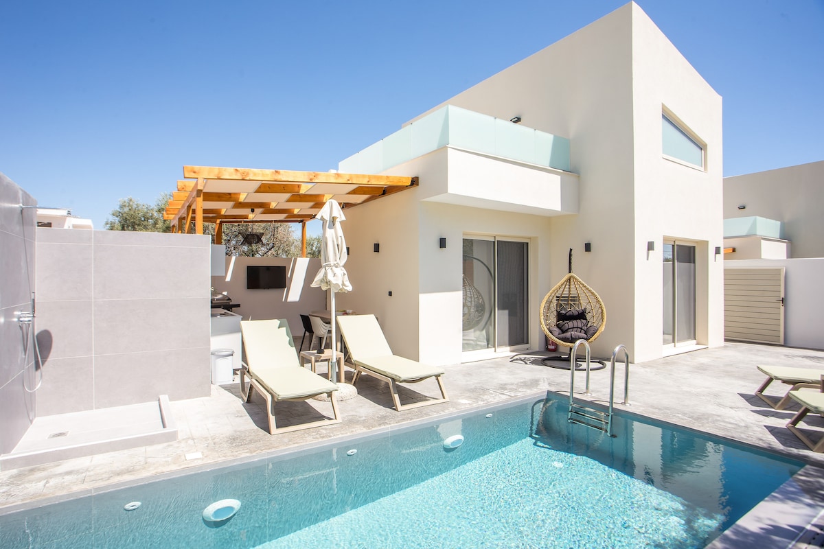 Our villa is your private oasis in Rhodes. Featuring 3 king-size beds, a jacuzzi next to the pool, palm trees, sun loungers, and an outdoor dining area, it feels like your own private spa resort , reserved only for you. Just 1 minute from the beach and offering every comfort in a private setting, it’s the perfect place for couples and families to enjoy moments of pure relaxation and space. Its location is ideal: only 6 minutes from the airport, 15 from Rhodes town, and 20 from Faliraki.