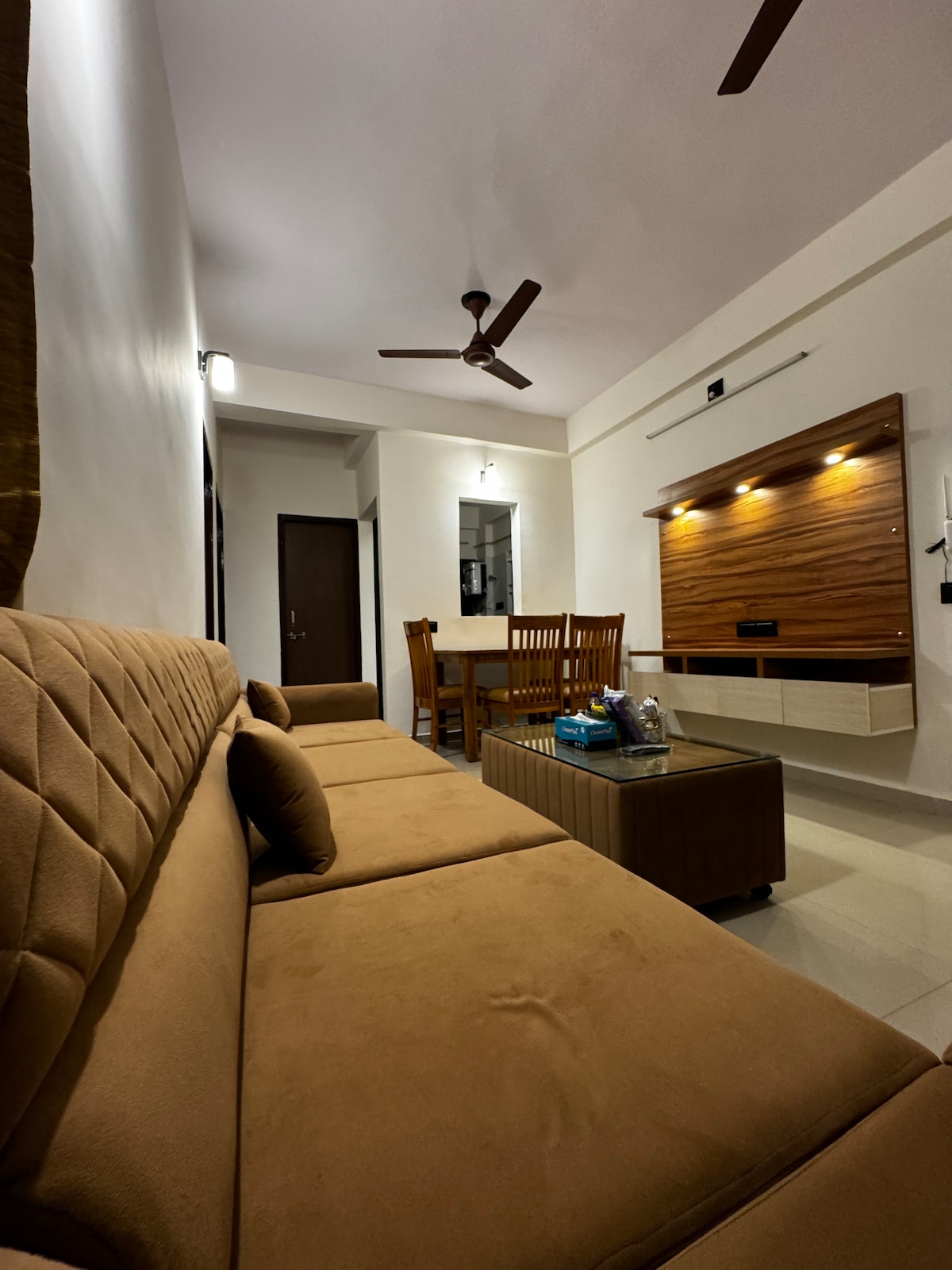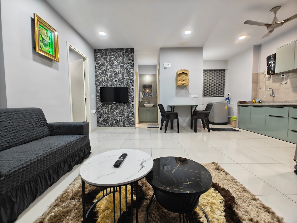 Bagong service apartment sa Godrej Garden City, Ahmedabad. May 2 kuwarto ang apartment, na may 1 queen size na higaan para sa 2 tao at sofa na puwedeng gawing 6×6 na king size na higaan. Available ang mga pasilidad tulad ng telebisyon, study/ work table, washing machine, kusina kabilang ang refrigerator, induction cook top, maliliit na kagamitan, steel cutlery, nakakonektang banyo na may pampainit ng tubig, iron box, first aid kit at shoe stand. Available ang AC sa isang silid - tulugan at available ang air cooler sa bulwagan.
