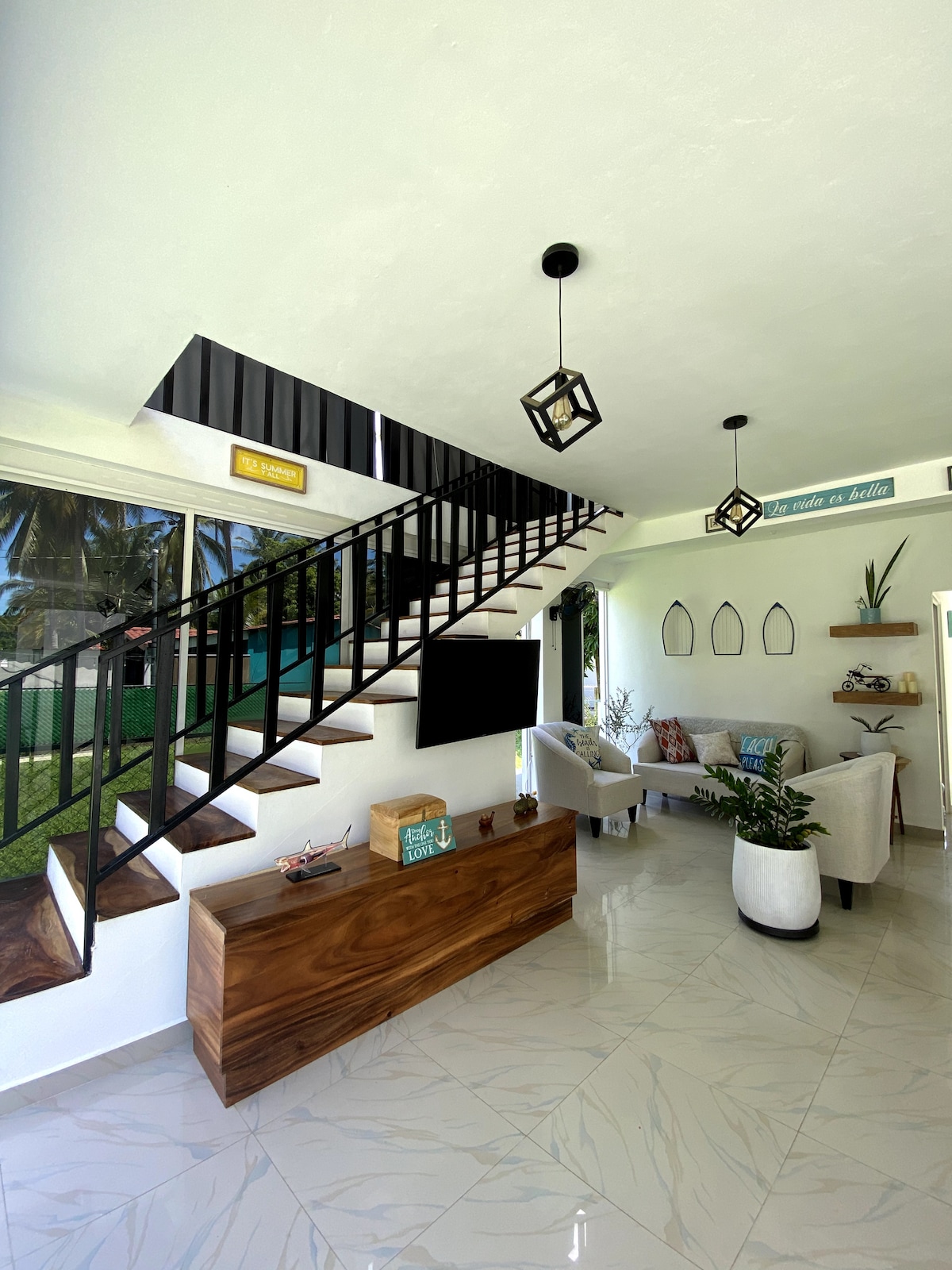 Bagong gawa, kamangha - manghang oceanfront beach house property property property. Nagtatampok ang property na ito ng pangunahing bahay na may tatlong silid - tulugan na may sariling banyo at A/Csets sa bawat kuwarto. May banyo, pangunahing dining room, breakfast room, at bar ang sosyal na rantso. Ilang hakbang lang ang layo ng lahat ng ito mula sa nakakapreskong filter pool. Ang mga hardin ay naka - program at ang kanilang kamangha - manghang berde ay naiiba sa asul ng dagat. Nilagyan ang kusina ng refrigerator, freezer, kusina, at lahat ng kagamitan.