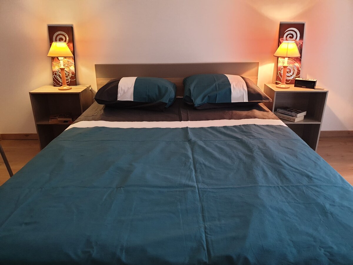 Mainit na apartment na 72 m2 sa 3rd floor na walang elevator. Matatagpuan ito sa isang maliit na tahimik na condominium, na matatagpuan sa gitna ng sentro ng lungsod 2 minutong lakad mula sa Carrefour Market; mula sa palengke at sa pangunahing kalye na may mga tindahan at restawran nito. 10 minutong lakad ang layo mula sa istasyon ng tren. Libreng pribadong paradahan sa condo at libreng paradahan sa kalye. Para sa paradahan, ipinaalam ko sa iyo na hindi masyadong malawak ang dead end para ma - access ito.