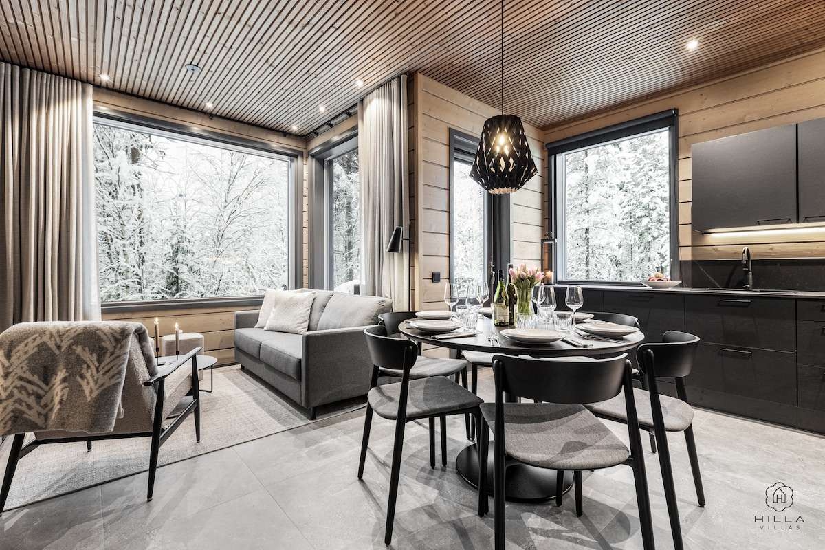 Napakataas ng klase sa pinakamagandang cottage sa tabi ng Ylläs, 6+2 tao. Ang kusina ay may mga premium na kagamitan para sa mas mahirap na pagluluto. Wine cabinet. Mga nakakamanghang bintana ng landscape na nakaharap sa kagubatan. Malaking carport - electric car charger. Isang bakuran sauna (kuryente) na dumadaan sa patyo ng salamin. Fireplace sa labas na may glass deck at isa pang fireplace sa loob. Mainam ang lokasyon. Nature Center Kellokas 200m. Mga trail ng hiking, pagbibisikleta, pag - ski, at snowmobile 200m. Ski bus 200m, ski resort na humigit - kumulang 500m.