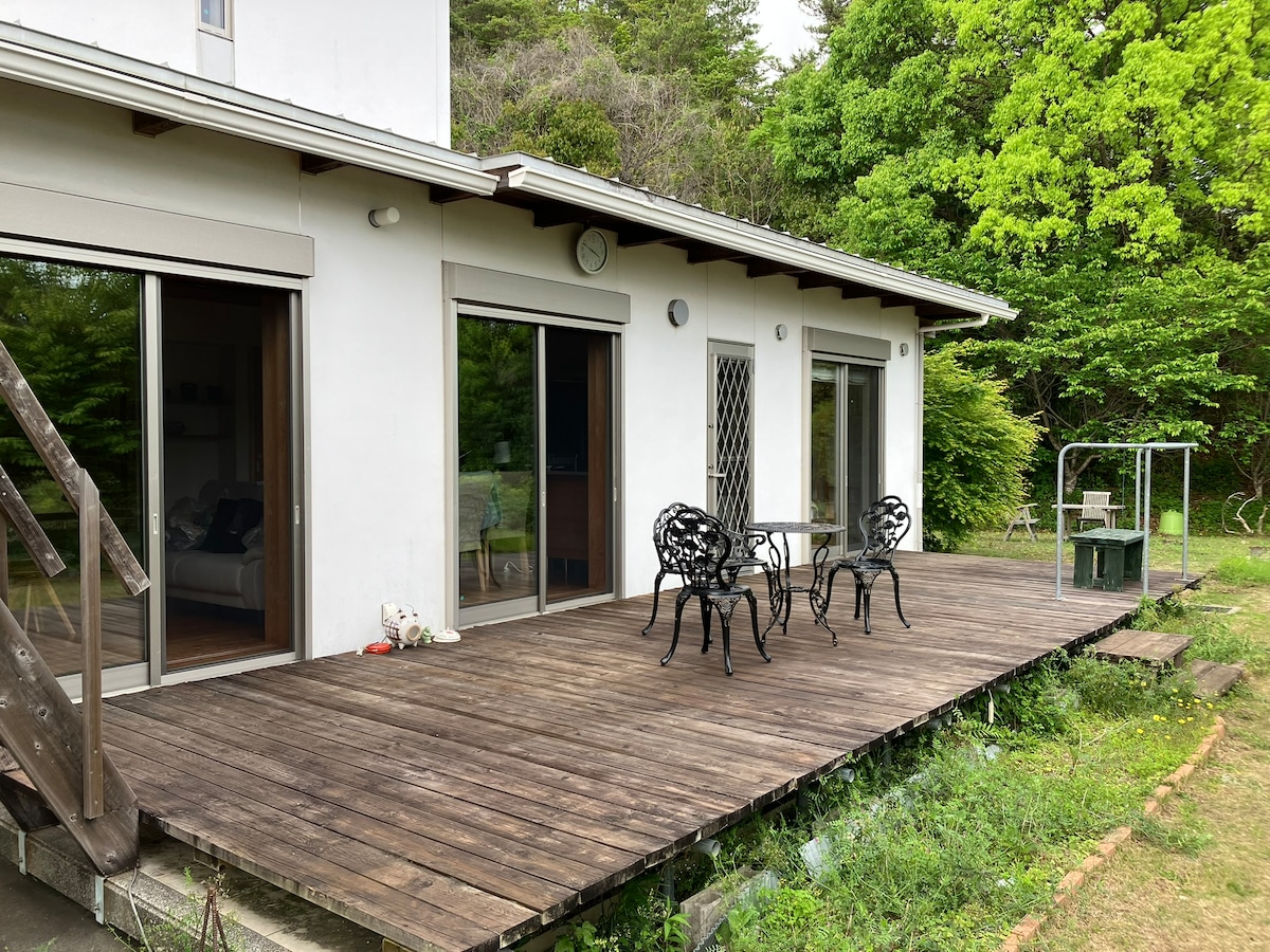 Matatagpuan ang maestilong tuluyang ito na may open-air na paliguan sa maliit na burol na tinatanaw ang dagat. May taniman ng gulay sa malawak na hardin, at sa tagsibol, namumulaklak nang lubos ang mga cherry blossom. Masisiyahan ka sa kalangitan sa gabi kung saan malamang na mahulog ang mga bituin mula sa pinakamagandang terrace sa rooftop para sa pagtingin sa bituin. Magrelaks kasama ang iyong pamilya at mga kaibigan.