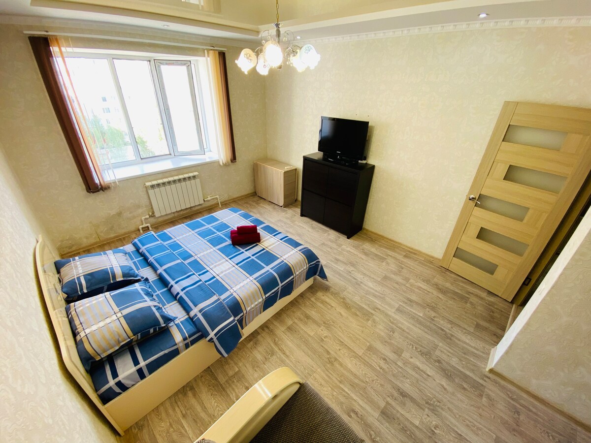 Nasa lugar ng istasyon ng tren, may tahimik na bakuran, may video surveillance sa bakuran, may intercom, puwede kang mamalagi nang may kasamang mga bata, puwede kang mamalagi nang may kasamang mga alagang hayop. Minsan sa isang linggo, nililinis ang apartment at pinapalitan ang mga sapin sa higaan. Mag-almusal, manghali, at maghapunan. Malapit dito ang Tagam dining room, isang chain na matatagpuan sa buong Kazakhstan, kung saan puwede kang magpa‑transfer mula sa istasyon ng bus at istasyon ng tren.
