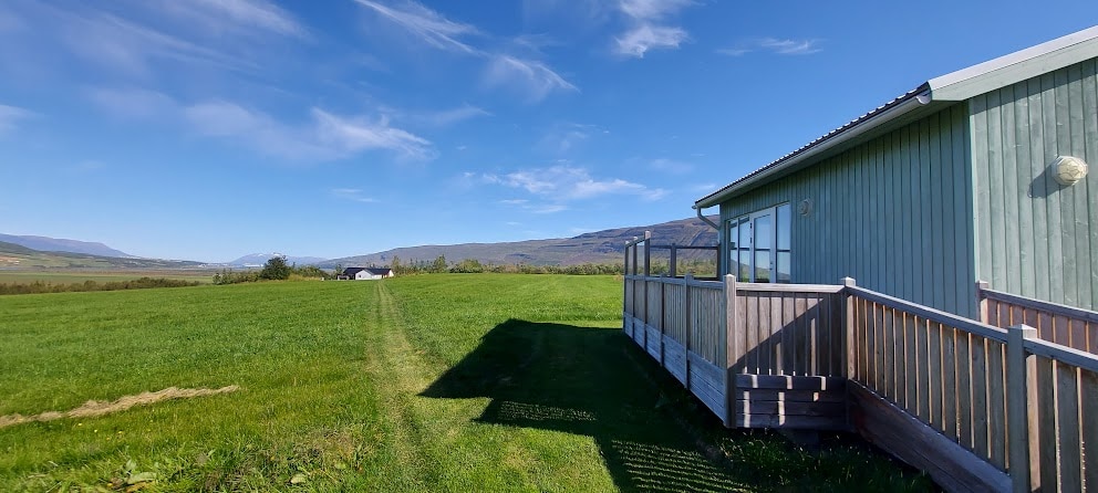 Ang aming guest house ay isang maliit na bahay na 15 sqm. Ang bahay ay nasa lote na nasa timog ng aming bahay. Ang tanawin ng fjord ay natatangi at ang tanawin ng bundok ayon dito. 4.5 km ang layo sa sentro ng Akureyri, na nag-aalok ng lahat ng posibleng serbisyo. Puwede ang motorsiklo. May hot shower sa labas.