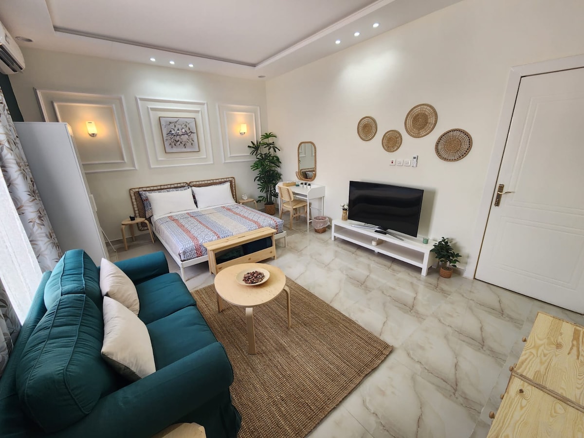 Matatagpuan ito sa kapitbahayan ng Al Murabba sa gitna ng Riyadh. Malapit ang lokasyon sa Pambansang Museo at dalawang istasyon ng metro, kaya madali at mabilis kang makakapunta sa iba't ibang bahagi ng lungsod. May kumportableng higaan at sofa bed na angkop para sa dagdag na bisita ang studio kaya mainam ito para sa mga indibidwal o bisitang nangangailangan ng dagdag na espasyo para magrelaks. Mayroon din itong kumpletong kusina, smart screen, high‑speed internet, at air conditioning na nagtitiyak ng komportableng kapaligiran sa buong pamamalagi. Ang lugar ay angkop para sa mga negosyante, turista, at panandaliang pamamalagi, at nagbibigay ng tahimik na kapaligiran na may sentrong lokasyon na malapit sa mga pinakakilalang landmark at serbisyo ng Riyadh