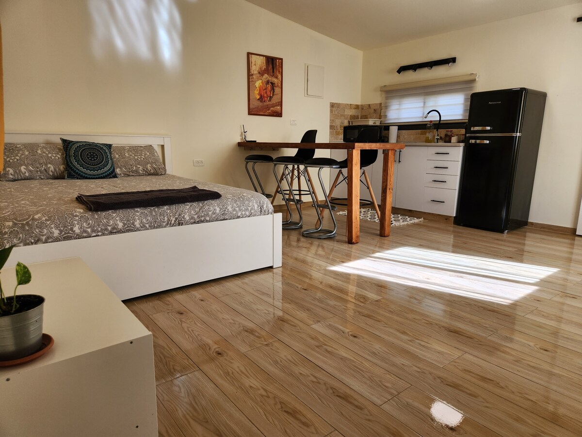Isang magandang yunit ng disyerto, bago at matamis na may hiwalay na pasukan, pribado at komportableng bakuran na may pergola, komportableng lugar na nakaupo at higaan ng damo. Maginhawa at maganda ang dalawang kuwarto sa Tzivit. Ang isa ay isang silid - tulugan na may mineral na plaster at isang malaking bintana kung saan matatanaw ang pribadong bakuran at ang isa pang sala at kusina na mayroon ding dalawang bintana at bubukas ito sa bakuran. Ang yunit ay may linya ng magandang sahig na bato at pinalamutian ng mga teal window. Maaliwalas ang banyo at nakakaengganyo ang shower. Matatagpuan ang yunit malapit sa baryo ng craftsman ng Tzukim at malapit lang sa tahimik na paglalakad sa disyerto. Ang aming lokasyon ay nagbibigay - daan para sa isang natatangi at mapayapang bakasyon kundi pati na rin ang opsyon na bumaba sa Eilat para sa isang day trip