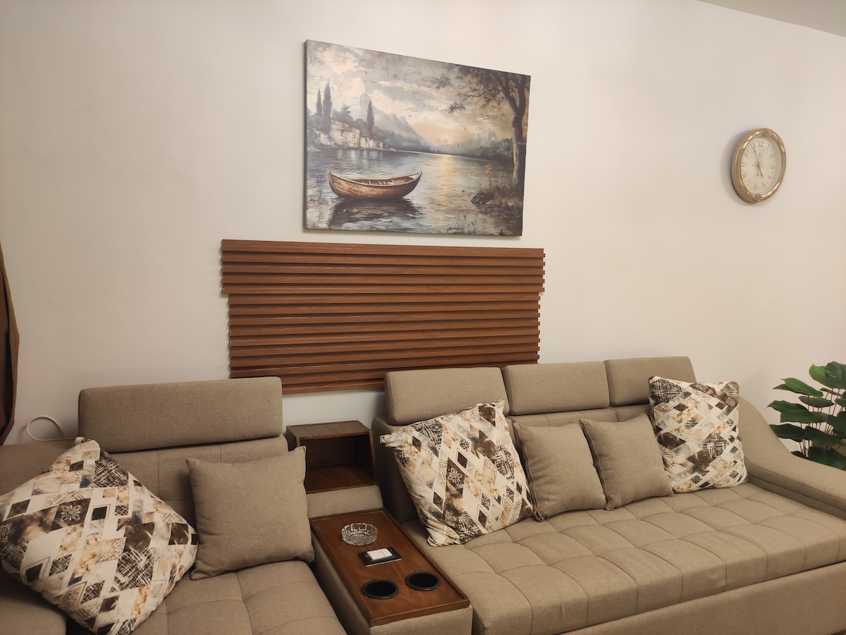 “Makaranas ng modernong kaginhawaan sa apartment na ito na may kumpletong 2 silid - tulugan sa Privado, Madinaty. Nagtatampok ang naka - istilong sala ng komportableng upuan, smart TV, at high - speed WiFi. Matatanaw ang mayabong na halaman, perpekto ang apartment para sa pagrerelaks o pagtatrabaho. Nilagyan ang kusina ng microwave, washing machine, at marami pang iba para sa iyong kaginhawaan. Ang mga maliwanag na silid - tulugan na may masarap na dekorasyon at malalaking bintana ay nagdaragdag sa kagandahan, na ginagawa itong perpektong bakasyunan para sa komportable at tahimik na pamamalagi."