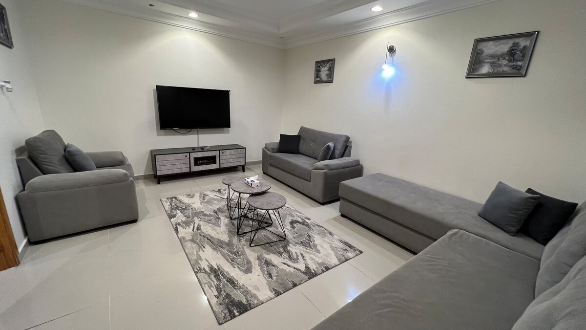 شقة واسعة مع صالة 20م²، غرفة ماستر وغرفة بسريرين مزدوجين، دورتي مياه (عربية وأوروبية)، مطبخ مجهز، بلكونة، إنترنت سريع، تلفزيون، تكييف، غسالة، مصعد ومواقف. Spacious apartment with 20 m² living room, master bedroom & double-bedroom, two bathrooms (Arabic & European), kitchen, balcony, internet, TV, AC, washing machine, elevator, parking.