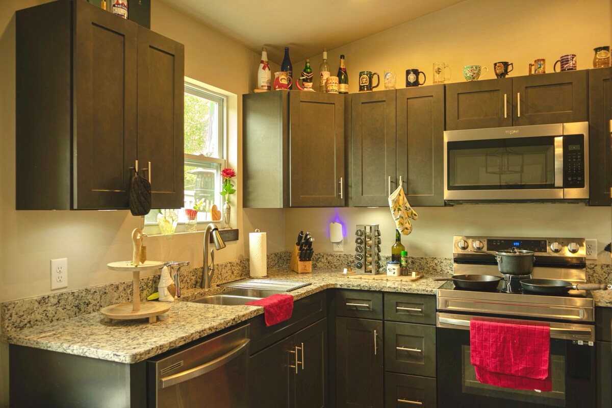 Maligayang pagdating sa marangya, magaan at maluwang na pamumuhay! Ginawa ang bagong inayos na tuluyan na ito nang isinasaalang - alang ang iyong kaginhawaan. Ang magagandang muwebles, likhang sining, mahusay na kalidad na king mattress at linen ay magbibigay - daan sa iyo upang ganap na makapagpahinga at magpabata. Masiyahan sa mga pagkain sa mahusay na kagamitan, malaking kusina na may kainan sa loob o pribadong patyo. Gamit ang washer at dryer, mayroon ka ng lahat ng kailangan mo para gawing madali, maginhawa, at marangya ang iyong pamamalagi! Libreng may sapat na "bisita lang" na paradahan at Tesla na 44 milya kada oras na pagsingil.