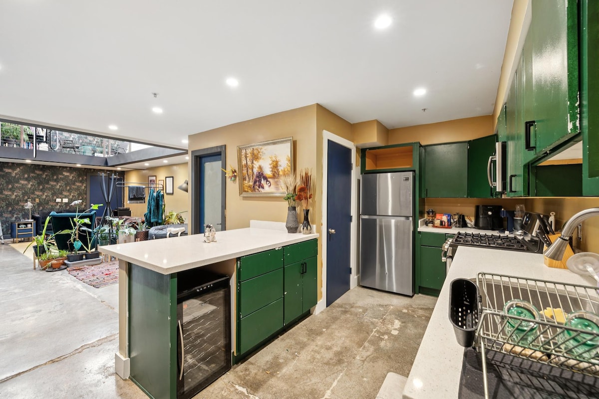 Step into a one-of-a-kind 1,100 sq ft warehouse loft in West Oakland where luxury, art, and indulgence collide. Designed as a living art gallery with Hollywood Regency glamour and jungle urbanism, this adults-only retreat features an indoor spa hot tub, private loft cinema, king mezzanine suite, and a professional creator’s workstation — all wrapped in lush greenery and dramatic skylight ambience. Seven minutes to both downtown SF and Oakland by train… but you may not want to leave.