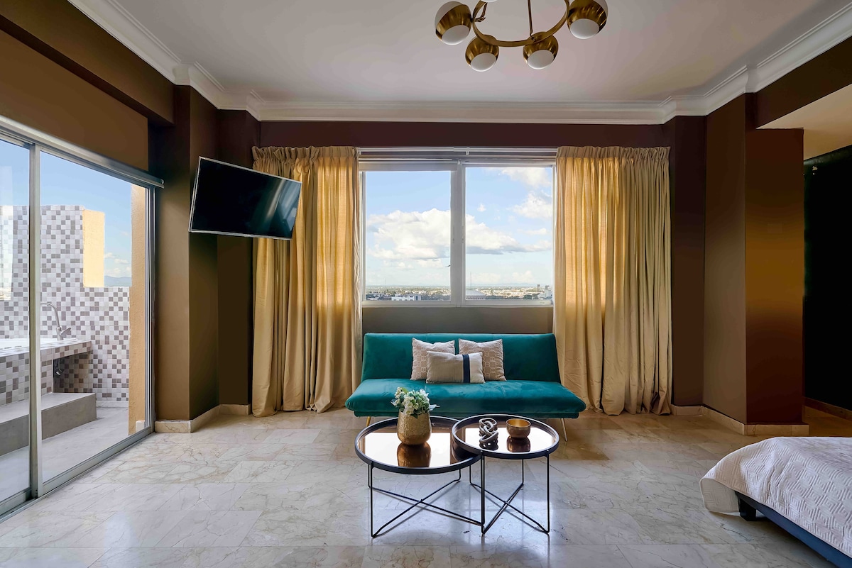 Mag - enjoy sa naka - istilong karanasan sa lugar na ito na may gitnang lokasyon. Ang perpektong apartment para sa isang pagtakas sa lungsod, darating sa bakasyon o naghahanap ng isang lugar upang gumana nang tahimik. Nilagyan ng air conditioning, mga de - kalidad na kasangkapan at modernong dekorasyon na magiging komportable ka sa bawat sulok. Mayroon kaming outdoor area sa rooftop, swimming pool, at gym na nilagyan ng lahat ng kailangan mo para makapag - ehersisyo.