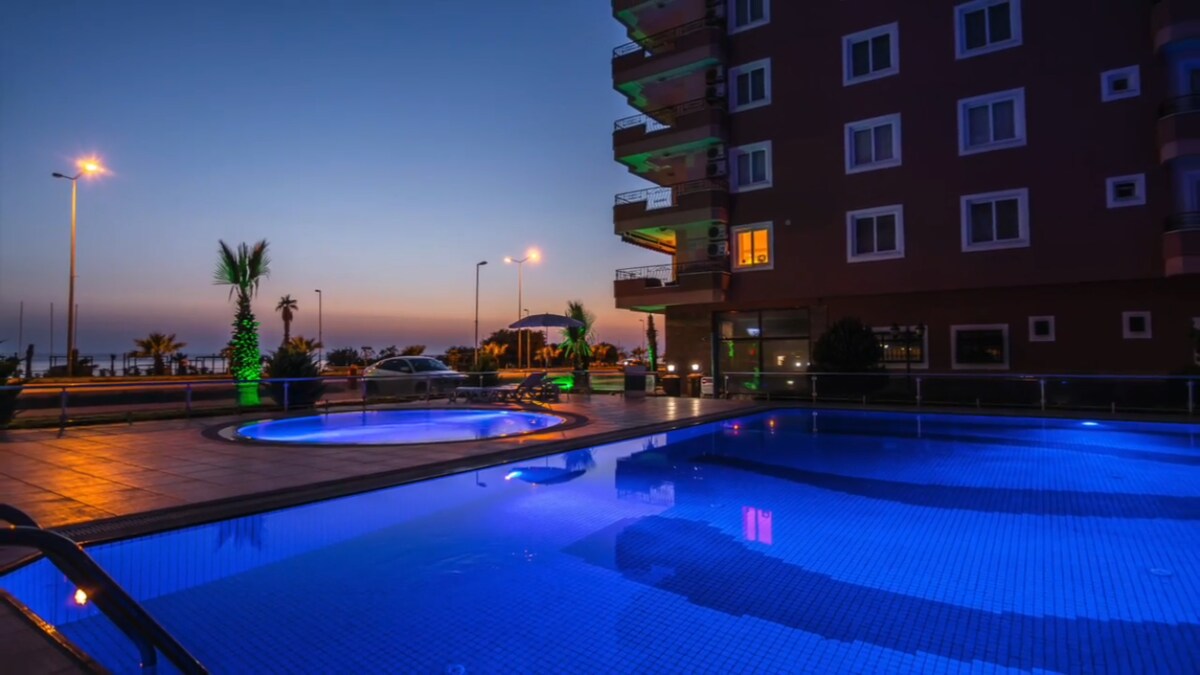 Magandang Beachfront 1 +1 Apt. Lexus Residence (70m2) Mga Bagong Muwebles, Access sa beach at tanawin ng dagat. Buong aktibidad sa lahat ng panahon na may malaking balkonahe para ma - enjoy ang iyong kape at pagkain sa umaga Smart Key Sariling Pag - check in 7 km papunta sa Center at 35 km papunta sa Gazipasa Depende sa panahon ng malaking indoor at outdoor pool, Fitness, Water Slide, Tennis Court, Game room, Cinema Salon, Children's playroom. Party room, BBQ area at 7/24 Security (Turkish Bath, Sauna bukas sa katapusan ng linggo) Pinakamahusay na tinatangkilik ng mga mag - asawa at Pamilya.