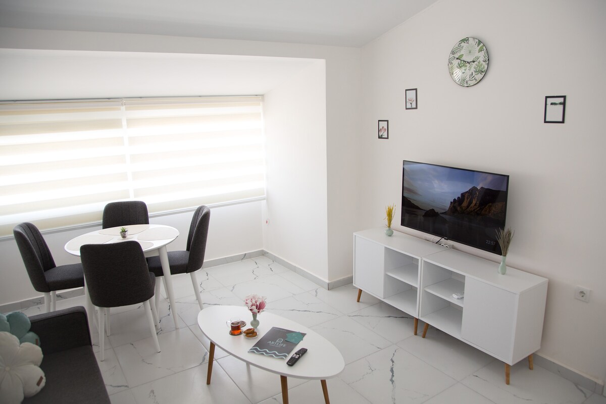 May sariling estilo ang pambihirang tuluyan na ito para maging komportable ang pamamalagi sa Turkey! Dalawang silid - tulugan na apartment na may malaking sala (walang balkonahe), WALANG BINTANA sa silid - tulugan!, nilagyan ng kusina, paliguan na may shower cabin. Air conditioning sa bawat kuwarto, oven, electricstove, microwave, maraming iba 't ibang pinggan, Smart - TV, aparador, bakal na may ironing board, washing machine, atbp. Mayroon ding sabon, shower gel. Magbibigay kami ng baby bed kung hihilingin.