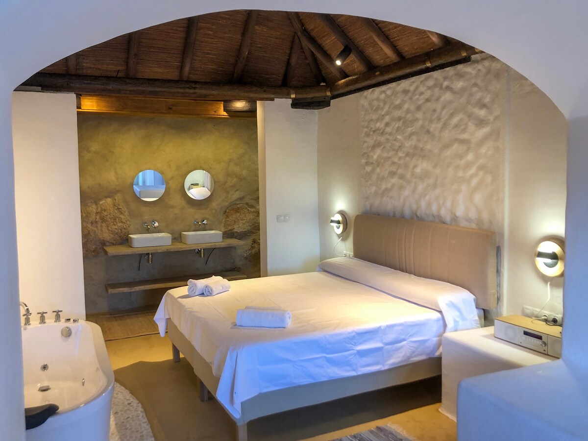 Napakagandang BUKID na may POOL AT KUWEBA. Natatanging enclave sa Disyerto ng Tabernas; tradisyonal na arkitekturang Almerian para masiyahan sa katahimikan ng kalikasan, hiking, sinehan, paglubog ng araw at mga tanawin. Matatagpuan malapit sa mga theme park, speed circuit, mga ruta ng sinehan at lahat ng serbisyo ng nayon: kaligtasan, kalusugan, pagkain. Masiyahan sa pool, barbecue, at mga romantikong gabi na may fireplace at bathtub para sa dalawa sa isang magandang kuweba.