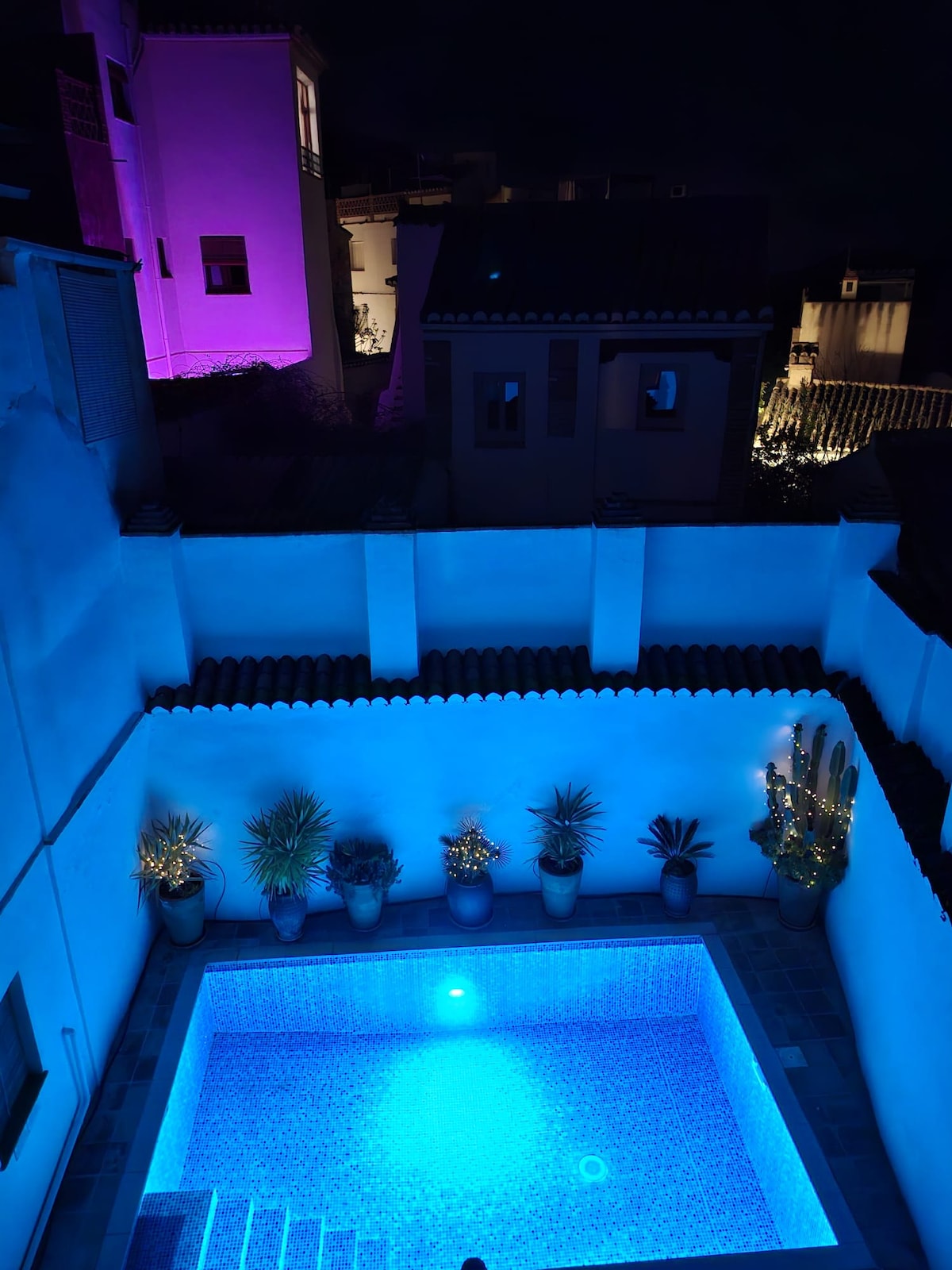 ThinkersINN, matatag na INTERNET, H/OFFICE, Double infinity POOL + Heated jacuzzi. Iniimbitahan ka ng tahimik na oasis Sa gabi, puwede kang mag‑enjoy sa masasarap na pagkaing Andalusian, mga inumin, at musika sa sentro ng lungsod. May 2 studio sa gilid ng Hacienda, at pribado ang pool at para lang sa bahay namin. Ang kuwarto (higaang 2m ang haba), rainforest shower, AC, SmartTV, glassed terrace, kitchenette, Weber gas grill Napakatahimik at pribado ng aming bahay na nasa gilid lang ng sentro at nasa kalsada ng Tarmac na may libreng paradahan.