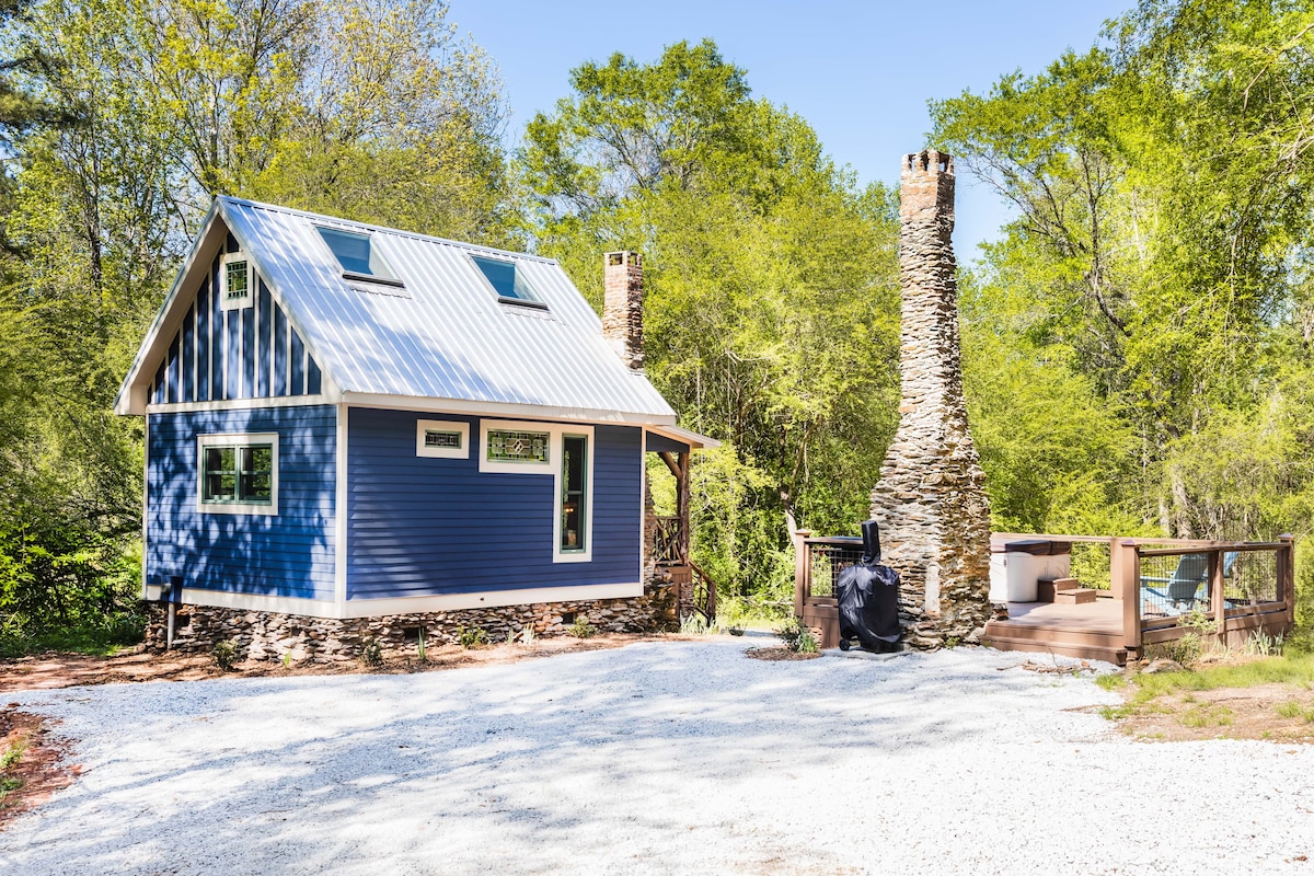 Escape to our fairytale, on 100 secluded acres of gorgeous forest on Lake Wedowee/river (short walk to water down road). Soak in the hot tub, bake a pizza in the wood-fired oven, snuggle in nest swing or stroll the river road to swim or kayak. Hike to Wolf Creek and pan for gold. This gorgeous cabin is inspired by the 1840s rock chimneys-found in the forest—built with reclaimed heart of pine, stained glass & cedar from the woods. No tv—this is a place to unplug. No kids under the age