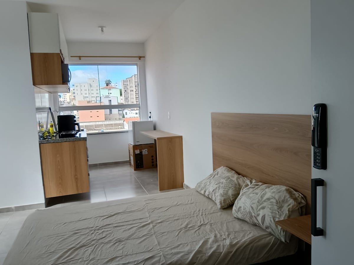 Bagong studio, 31 metro, may kasangkapan: aparador, double bed, compact na kusina, 2-burner induction stove, refrigerator, coffee maker, sandwich maker, microwave, 8.5-kilo washer, digital lock, ceiling fan, 32" TV na may mga app. Buong banyo. Panlabas na lugar na may malawak na tanawin. Matatagpuan sa sentro ng lungsod, malapit sa: mga tindahan, restawran, bangko, paaralan, pederal/pribadong kolehiyo, paaralan ng medisina, at Cadetes EPCAR Preparatory School. Linen ng higaan, mga tuwalya sa paliguan at mukha.