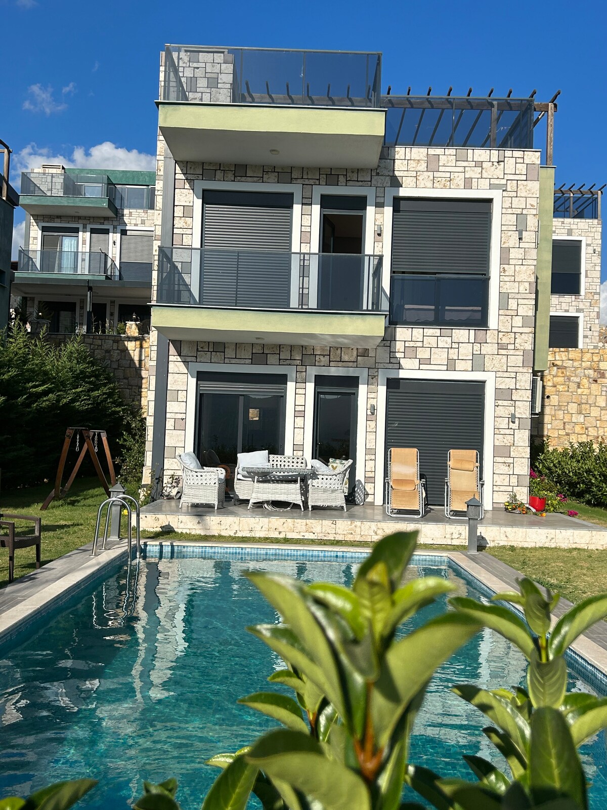 Müstakil havuzlu bu şık villada huzurlu bir tatil geçirin .Dört yatak odalı villada üç yatak odasında klima mevcuttur salon büyük ve klimalıdır kalabalık aileler çok rahat ve ferah bir şekilde kalabilir. salonda bulunan şömine ve bahçede bulunan ateş Çukuru ile kışın çok zevkli zamanlarda geçirebilirsiniz. Evle ilgili soru sormak isterseniz eğer0:5,3,2 ve 498 ile 93 doksanbeş