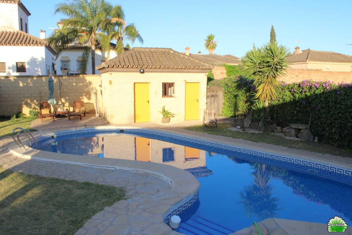 Chalet completamente único para los huéspedes a tan solo 20 min del aeropuerto de Sevilla donde destaca sus dimensiones, ya que cuenta con 5 dormitorios, 2 baños, uno con plato ducha y otro con bañera extra grande, amplio salón con chimenea y cocina totalmente equipada; dos grandes porches, piscina de grandes dimensiones, amplia zona de césped y jardín; aparcamiento para 5 coches, barbacoa. Es vuestro alojamiento para pasar momentos ideales tanto para familias como grupos.