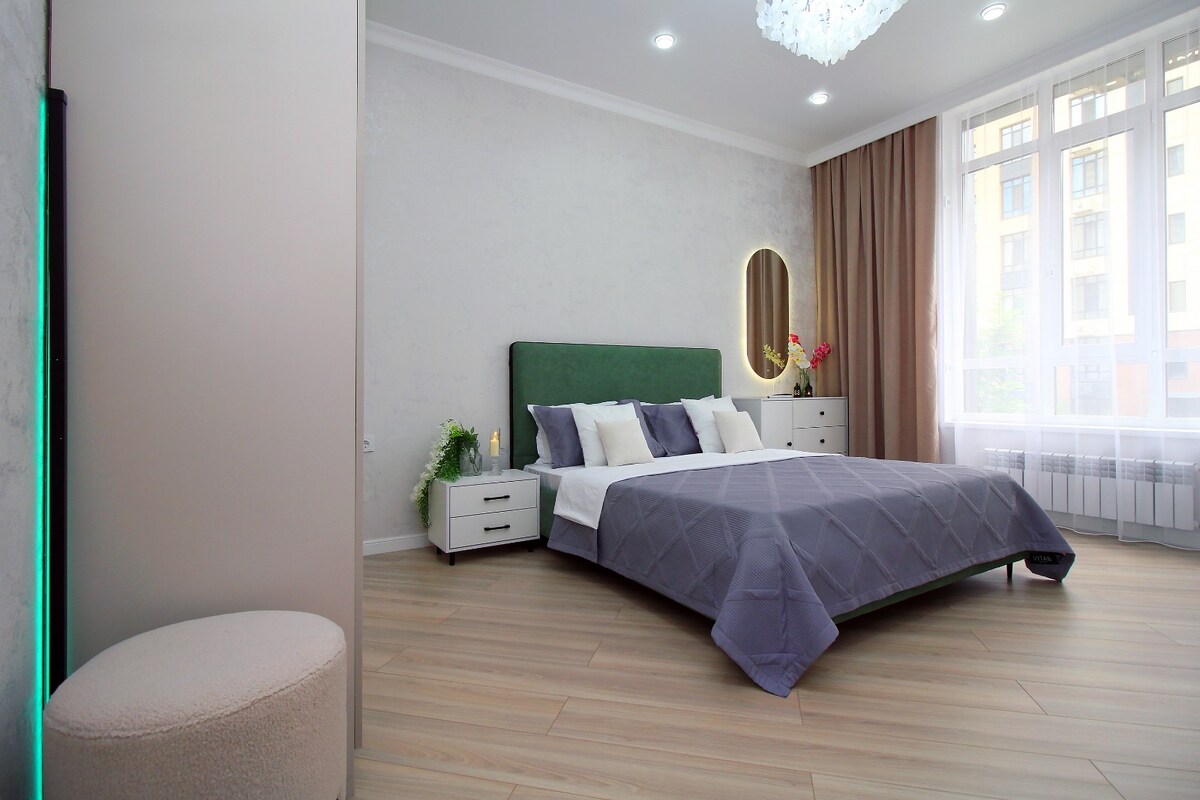 Ang pinakamagandang tanawin ng mga bundok sa Almaty! Mga mararangyang apartment sa pinakamagandang lugar at residential complex ng Almaty! Maluwag na premium apartment na may nakakahilong tanawin at pagsasaayos ng kalidad na may mga mamahaling materyales. Isang buong team ng mga bihasang designer ang nagtrabaho sa loob. Sa iyong pagtatapon ay: 2 malalaking TV sa kuwarto at sala, mga malalawak na bintana 3 metro ang taas kung saan matatanaw ang mga marilag na bundok ng Almaty (mula sa ika -29 na palapag ay may hindi kapani - paniwalang tanawin), kusina na may lahat ng kasangkapan sa bahay