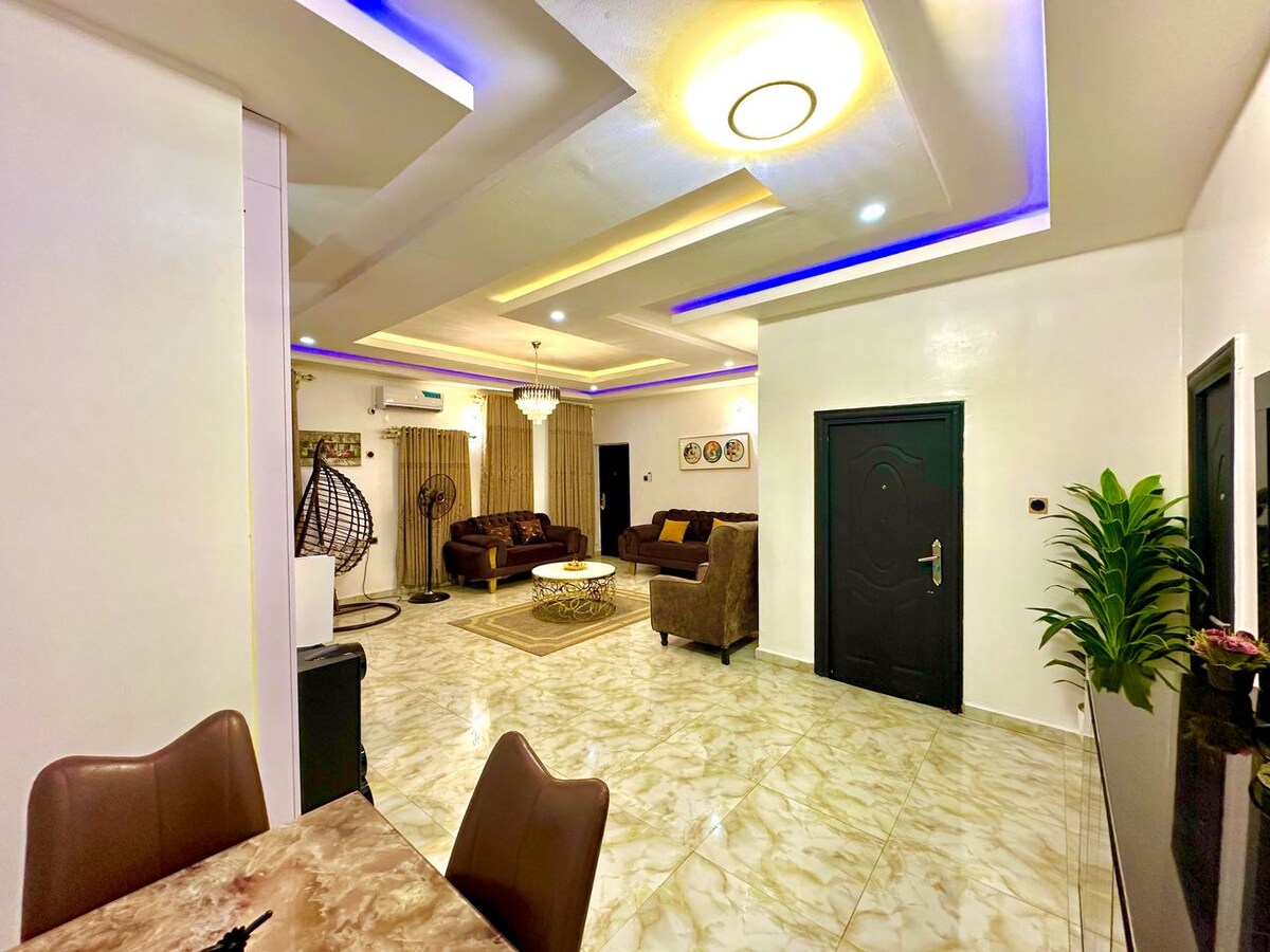 I am happy to host you , welcome ! This modern 3-bedroom apartment is your ideal retreat you would love to enjoy : - ACs in all rooms - Fast WiFi ,Cozy living area, - Cotton blinds for privacy - Well-equipped kitchen , - Soft bedding & ample storage ,Clean bathrooms with modern finishing . - Gated and secured compound - Solar light - Clean water Great for families, professionals & travelers. Comfort, style, and convenience await you