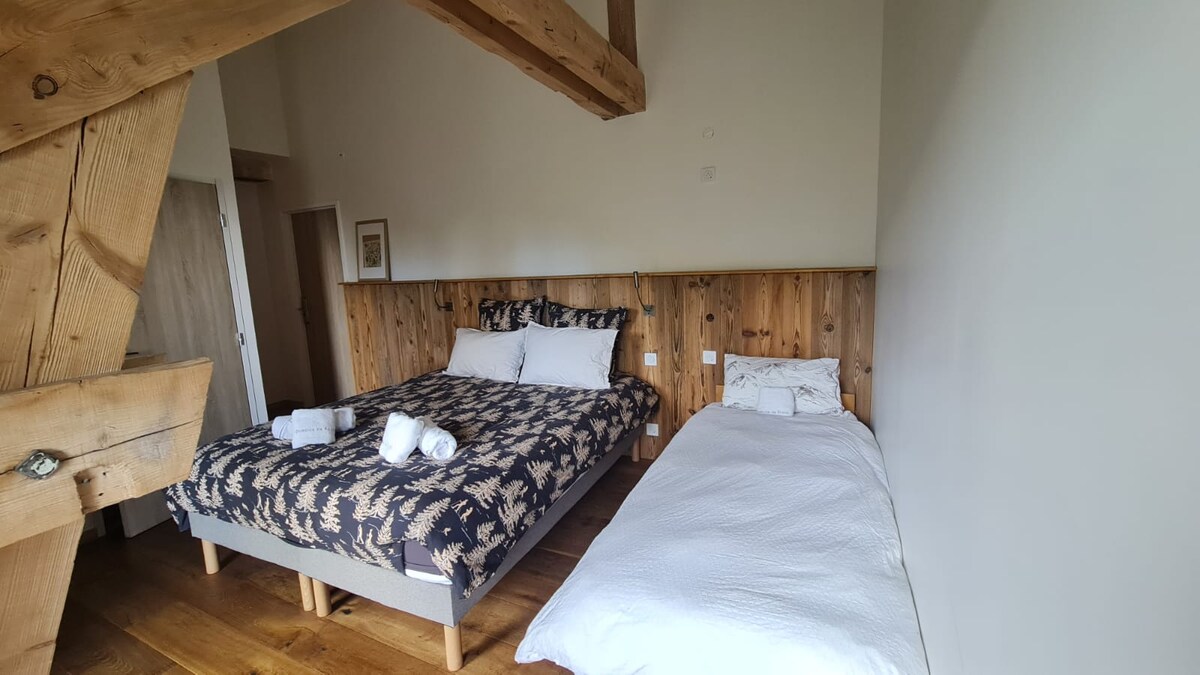 Nilagyan ang kaakit - akit na kuwartong ito na may tanawin ng bundok ng 160 x 200 double bed o 3 80 x 200 twin bed. Magmaneho sa isang bundok, mainit - init at intimate na kapaligiran sa loob ng hotel na Domaine de Rozan. Ang mga materyal na eco - friendly, dekorasyon ng cocooning, at kaginhawaan ng mga high - end na sapin sa higaan ay gagawing isang sandali ng kalmado at bukod - tangi ang iyong pamamalagi.