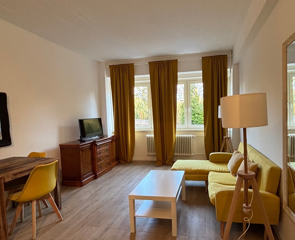 Nasa tahimik na lokasyon ang accommodation sa cul - de - sac sa tabi ng parke na may maliit na lawa. Tinatayang 35m² ang laki ng kuwarto, may sariling kusina at banyo at nag - aalok ng espasyo para sa 2 matanda at hanggang 2 bata na may double bed at sofa bed. Ang accommodation ay nasa basement at may taas na 2.09 m ang taas ng kisame. Ang mga supermarket at restawran (5 -10min) at pampublikong transportasyon (bus 2min) ay nasa agarang paligid. Karaniwang available ang pampublikong paradahan.