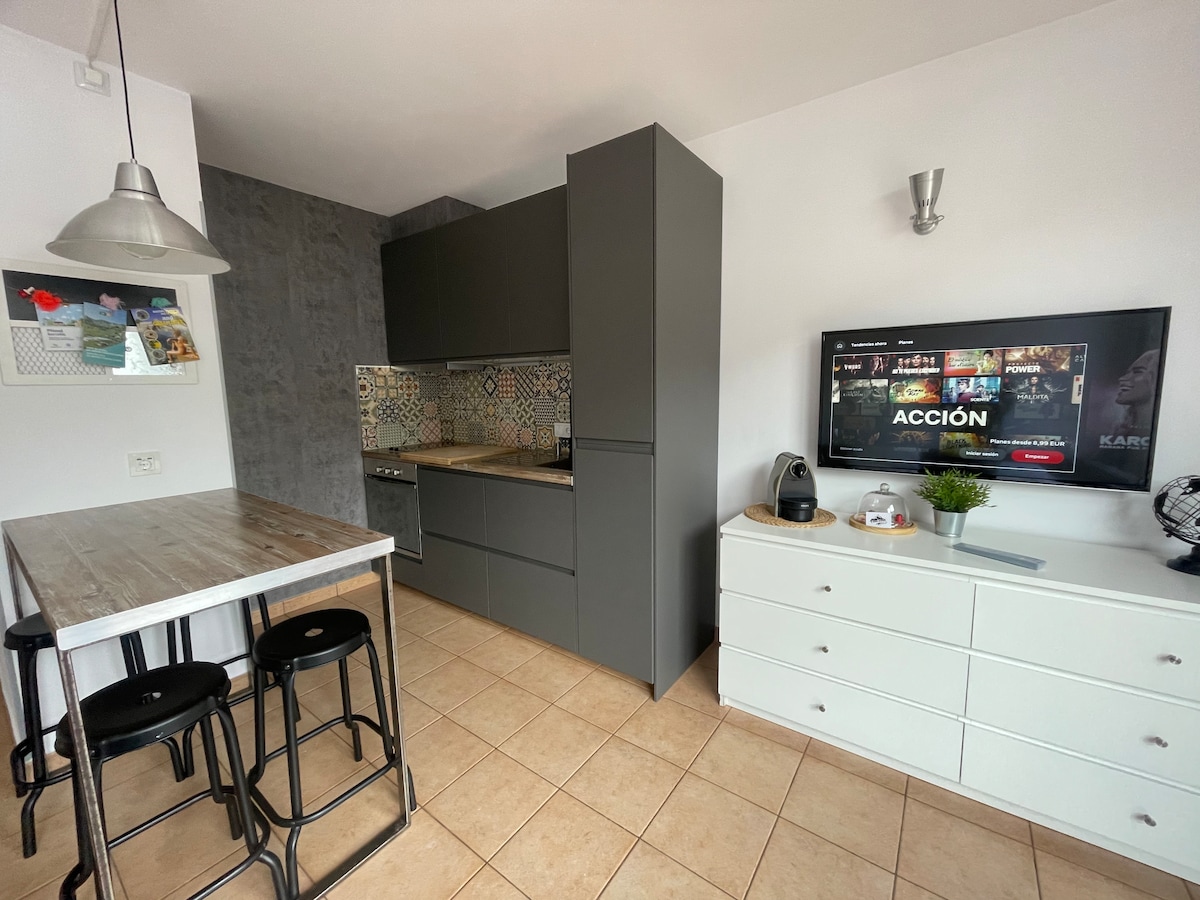 Tahimik ang apartment na ito. Lahat ng labas. Binubuo ito ng sala/silid - kainan na may maliit na kusina, balkonahe na may mga tanawin, sofa, smart TV. Ang kusina ay may refrigerator, washing machine, microwave, ceramic stovetop, mga kagamitan sa pagluluto, Nespresso at tradisyonal na coffee maker. Kumpleto ang banyo. Mayroon itong dalawang silid - tulugan, isa na may double bed at may maliit na balkonahe sa labas at ang ikalawa na may dalawang single bed. (Mayroon kaming apartment sa mas mababang palapag para makita ang isa pang listing sa Roní)