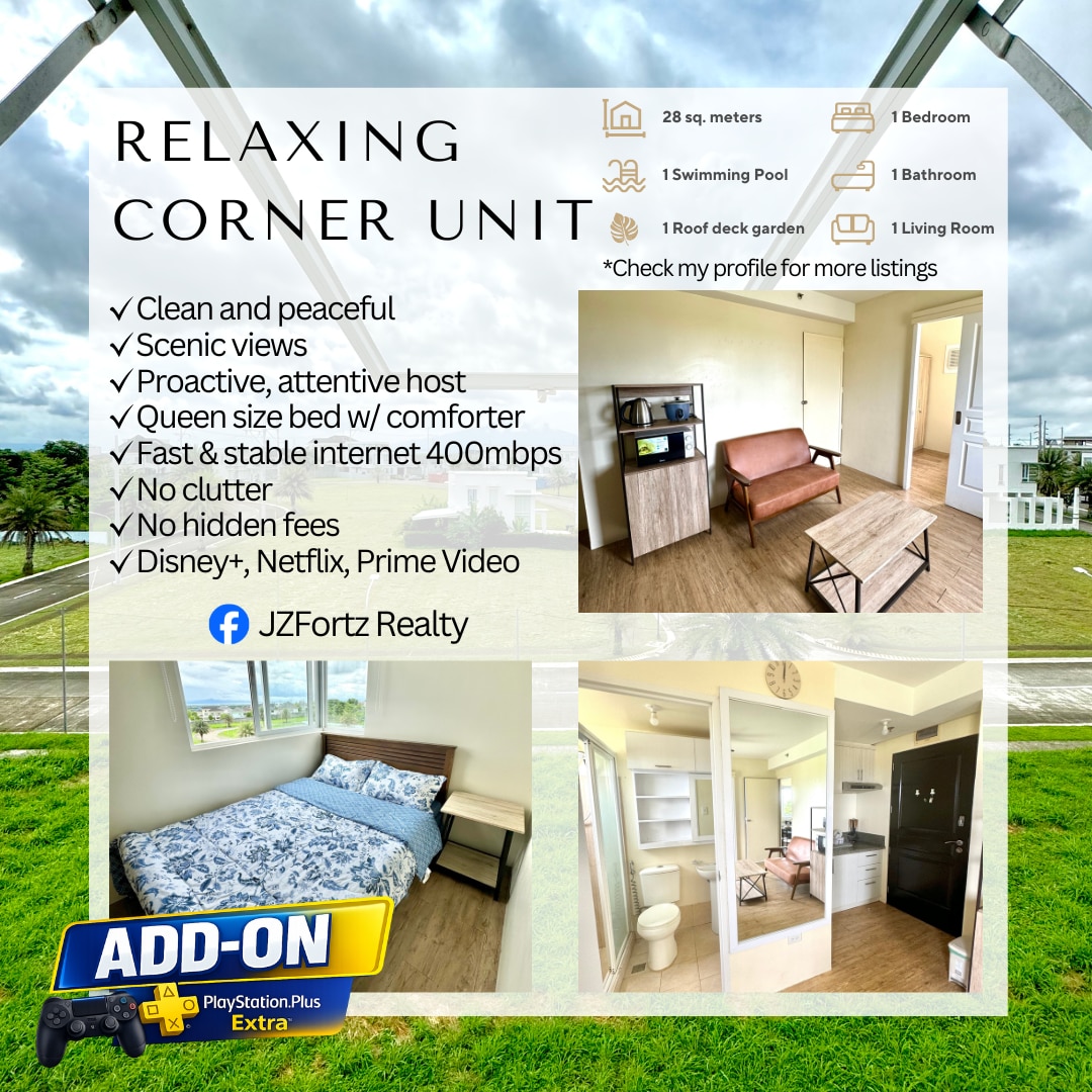 Ang yunit ng condo na may kumpletong kagamitan na matatagpuan sa pinakabagong joint development ng Ayala Land at Cathay Land. Matatagpuan sa gitna ng Nuvali at Tagaytay, maraming aktibidad na masisiyahan at mga lugar na puwedeng bisitahin sa buong araw. Tapusin ang gabi gamit ang swimming sa pool o pelikula (o pareho) gamit ang iyong 55" 4K TV na may Youtube/Netflix at 100 Mbps internet. Tandaan: Hindi na available ang Netflix dahil hindi na nila pinapayagan ang pagbabahagi ng account para sa iba't ibang address. Puwede ka pa ring mag‑log in sa personal mong account.