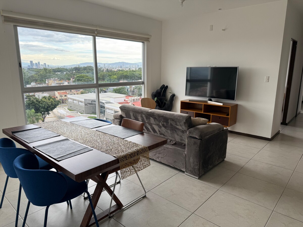 Apartment sa pinakamataas na palapag sa Zapopan Norte (ZIP 45130) na may pool at seguridad sa lahat ng oras. Dalawang kuwarto, dalawang banyo, maliwanag na sala at kainan, modernong kusina na may granite bar, at may takip na labahan. Symmetric 100 Mbps Wi-Fi at dalawang ligtas na paradahan. Tahimik na lugar para sa trabaho o pahinga. Ilang minuto lang ang layo sa Telmex Auditorium, Akron Stadium, Arena Guadalajara, at Andares. Perpekto para sa hanggang 4 na bisita.