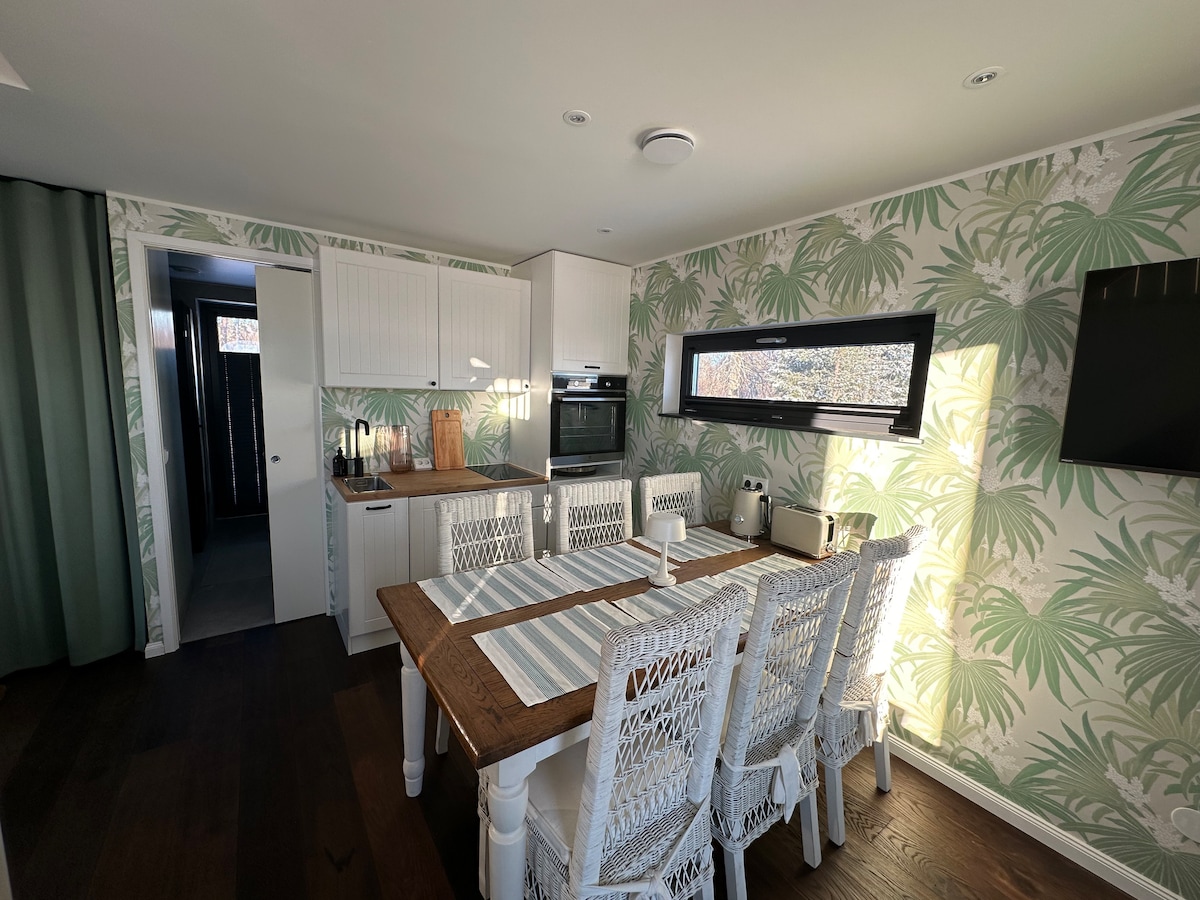 Ang sauna ay maaaring kumportableng tumanggap ng anim na tao, bagaman ang terrace ay may silid para sa mas maraming tao. Sa ibaba, puwede kang matulog sa malaking sofa bed, sa itaas ay may dalawang malalaking 160cm na kutson. Isang hagdanan ang magdadala sa iyo sa ikalawang palapag mula sa labas. May mga unan - kumot, bed linen, at bath towel. Ang kusina ay may lahat ng kailangan para sa pagluluto. May barbecue sa labas, pero magdala ka ng sarili mong uling. Mayroon ding barrel hot tub malapit sa ilog para sa dagdag na gastos na 60 EUR sa cash.