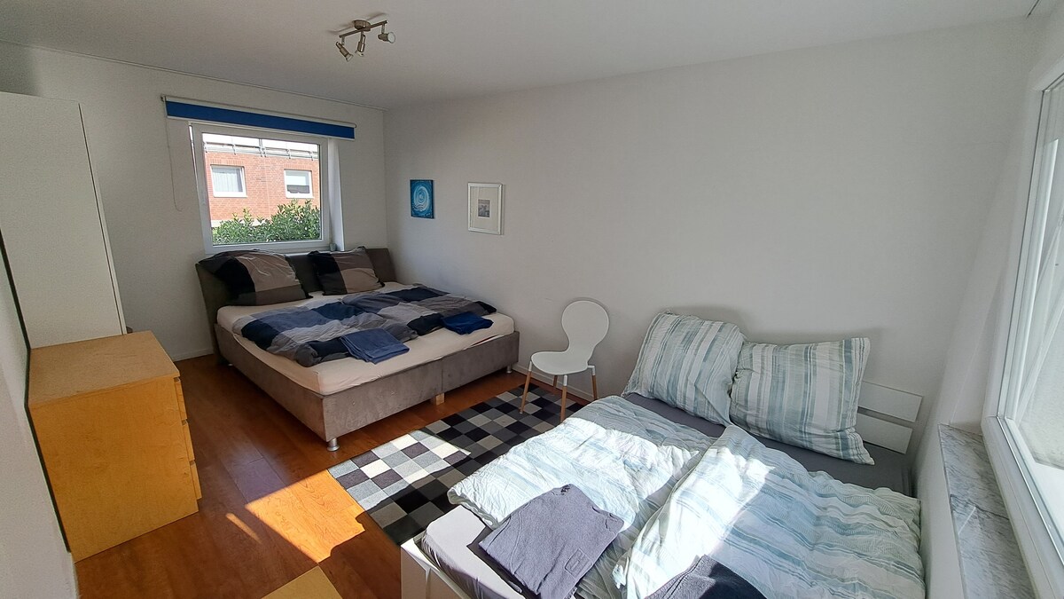 Matatagpuan ang duplex apartment sa 1st + 2nd floor ng terraced house. Nakakabighani ito sa malaki at bukas na planong sala na may kusina at katabing roof terrace. Sa unang palapag ay may dalawang silid - tulugan at isang shower room. Ang malaking silid - tulugan ay may king size (1.80 x2 m)- at queen size na higaan (1.40 x2 m). Sa maliit na silid ng tupa, may queen size na higaan (1.40 x2 m). Flexible ang pag - check in (ayon sa appointment)