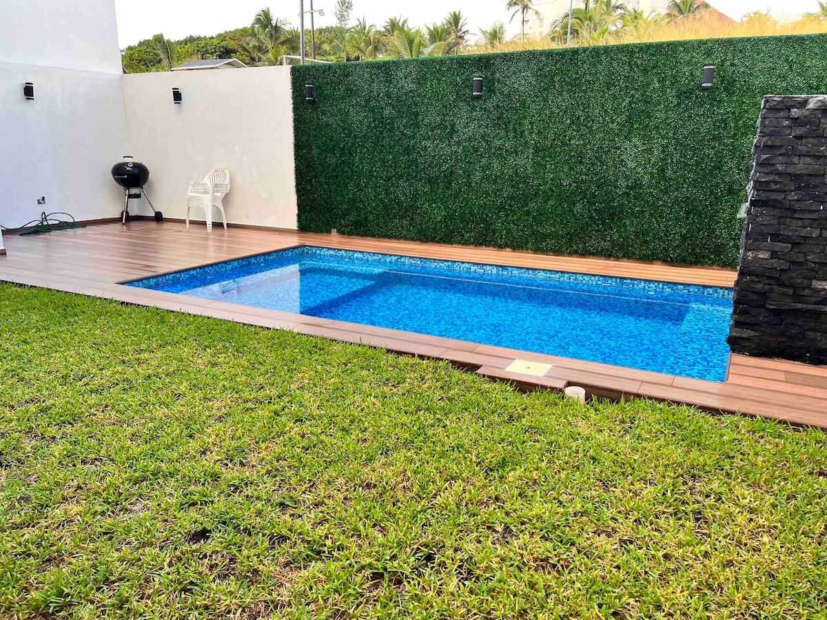 Pampamilyang bakasyunan na mainam para sa mga alagang hayop at may pribadong hardin at pool. 200 hakbang lang ang layo ng beach. 3 kuwarto, 2.5 banyo, at kusina na may malawak na sala, na handa para sa iyo upang mag‑enjoy kasama ang iyong mga mahal sa buhay. Beach club at Oxxo convenience store sa loob ng complex. 10 minuto mula sa Plaza El Dorado at 20 minuto mula sa Boca del Río. Perpekto para magrelaks at magsaya kasama ang pamilya. Privacy, comfort, at mga di‑malilimutang alaala kasama ng mga alagang hayop mo sa ligtas na lugar na pampamilya.