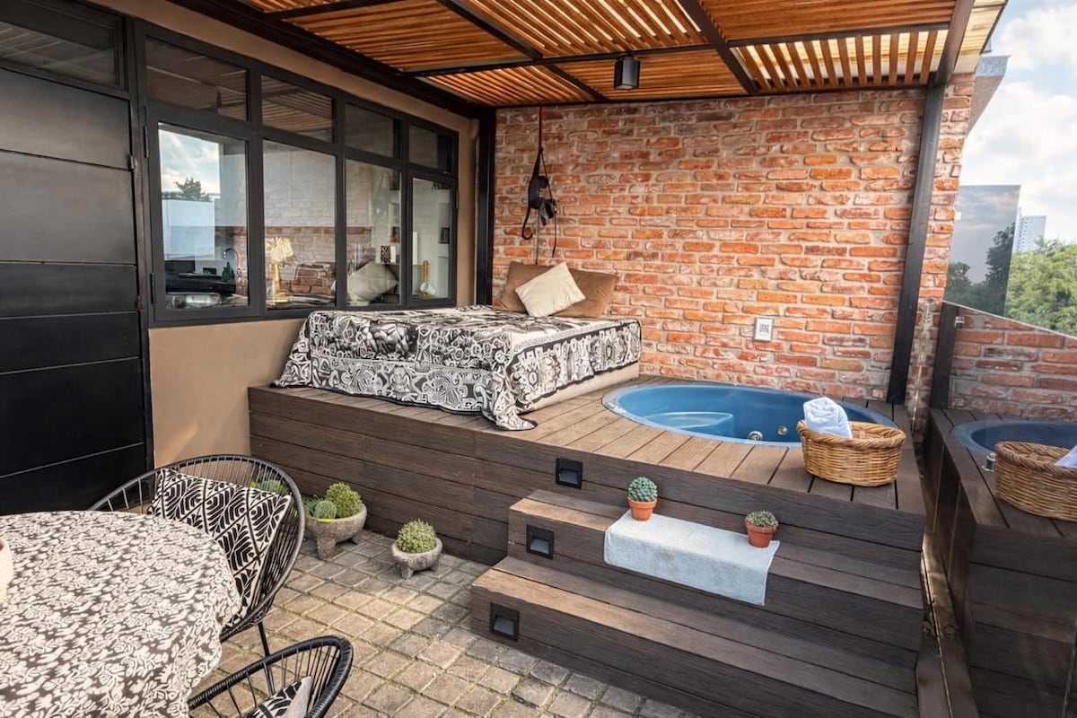 Tumakas sa komportableng penthouse loft na ito sa Polanco, na ipinagmamalaki ang pribadong terrace sa rooftop na may hot tub 🛁 at mga nakamamanghang tanawin 🌇 ng lungsod sa pagsikat ng araw at paglubog ng araw. Perpekto para sa isang romantikong bakasyon💕, nag - aalok ang upscale retreat na ito ng mga high - end na pagtatapos📶, napakabilis na Wi - Fi, kumpletong kusina🍳, at walang kapantay na lokasyon - isang bloke lang mula sa iconic na Masaryk Avenue. Masiyahan sa pagiging eksklusibo, kaginhawaan, at mga nakamamanghang tanawin 🌅 habang namamalagi sa gitna ng pinaka - eleganteng kapitbahayan ng Lungsod ng Mexico.x