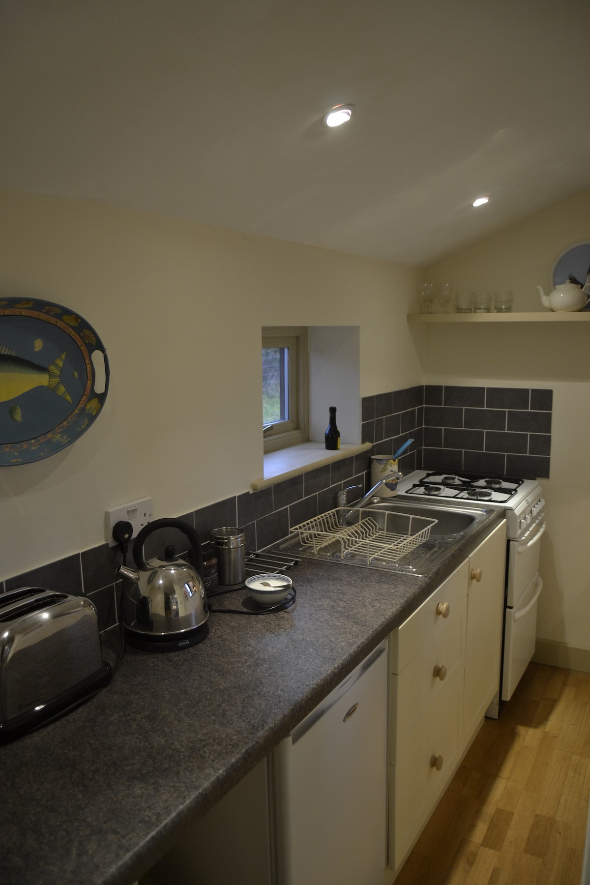 Isang silid - tulugan na self - catering house , na may paradahan. Nilagyan ang kusina ng oven ,microwave refrigerator /freezer, dishwasher. Ibinibigay ang tsaa ,kape, asukal,salt pepper oil. Ganap na pinainit sa gitna May isang napaka - komportableng double Hypnos bed na may malinis na puting linen at malambot na tuwalya. May underfloor heating at heated towel rail ang basang kuwarto. Mayroon ka ring sariling pribadong patyo na may mga mesa at upuan . Available ang travel cot kapag hiniling nang may dagdag na singil na £ 15 kada gabi min 2 gabi