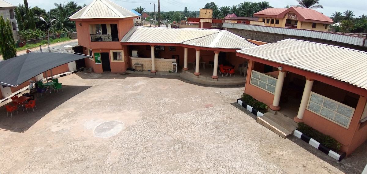 Welcome sa maganda at komportableng bungalow na may dalawang kuwarto na nasa gitna ng Asaba. Narito ka man para sa trabaho o paglilibang, magkakaroon ka ng tuloy‑tuloy na 24/7 na power supply at napakabilis na internet para hindi ka mawalan ng koneksyon. Pangunahing priyoridad namin ang kaligtasan at kaginhawaan mo. May CCTV at security sa lugar para masiguro ang kapayapaan ng isip. May tagapangalaga ng tuluyan na handang tumulong sa anumang tanong o pangangailangan sa panahon ng pamamalagi mo. Nasasabik na kaming magpatuloy sa iyo—handa na ang matutuluyan mo!