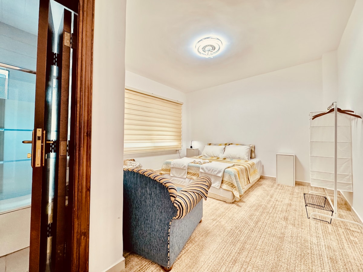 Manatili sa Estilo Sa Bagong Kagamitan at Kumpletong Kagamitan NA Kontemporaryong Apartment na ito, at mag - enjoy sa: > Mga Maliwanag at Maluwang na Kuwarto >Mga pribado at walang harang na tanawin ng lungsod > Mga Nangungunang Restawran/Café, tindahan ng grocery, at marami pang iba, lahat sa loob ng MAIGSING distansya. >Dynamic na Lokasyon, malapit sa lahat ng pangunahing kalsada sa lungsod. - 10 minutong biyahe ang layo ng Downtown:) Mga Amenidad: Wi - Fi Roaming (Hotspot 2.0) - Smart TV - Bathtub - AC's - Libreng Paradahan Mainam na opsyon ito para sa mga pamilya o kaibigan na gustong masiyahan sa komportableng five - star na pamamalagi sa Amman.
