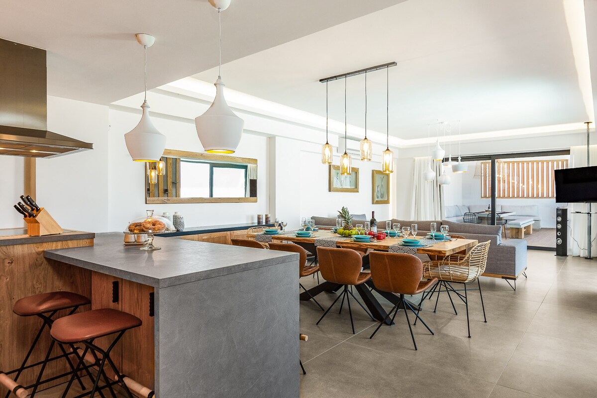 Kaakit - akit na suite na 215 sqm, na matatagpuan sa THESEUS BEACH VILLAGE, 20 minuto ang layo mula sa Heraklion. Ang Acalle Suite, na may panloob na lugar na 215 sq.m. at labas - beranda at hardin - 300 sq.m., ay kapansin - pansin dahil sa liwanag at modernong dekorasyon nito, na nag - aalok ng 3 silid - tulugan, na pinalamutian ng mga queen - sized na higaan na may magagandang gabi. Ipinagmamalaki ng property ang 2 napakagandang banyo, maluwang na sala at kusina, pati na rin ang storage space. May mga komportableng sofa at BBQ sa beranda. Tumatanggap ng hanggang 6 na tao.