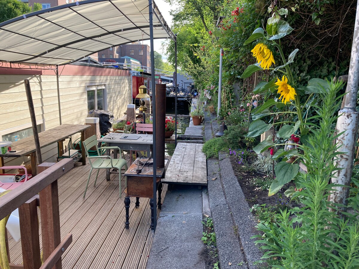 Bahay na bangka malapit sa Jordaan: natatanging tanawin ng kanal at hardin